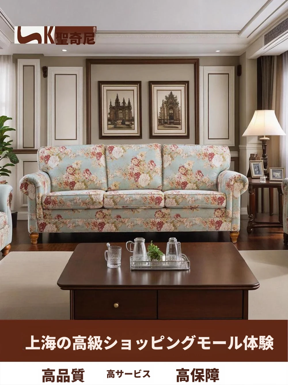 明月ソファ - フレンチビンテージデザインの厚手シェニールファブリックソファ、アメリカンアンティークスタイルのリビングにぴったり!洗練された直線美と快適な座り心地を実現。あなたのインテリアを格上げするアイテムです。