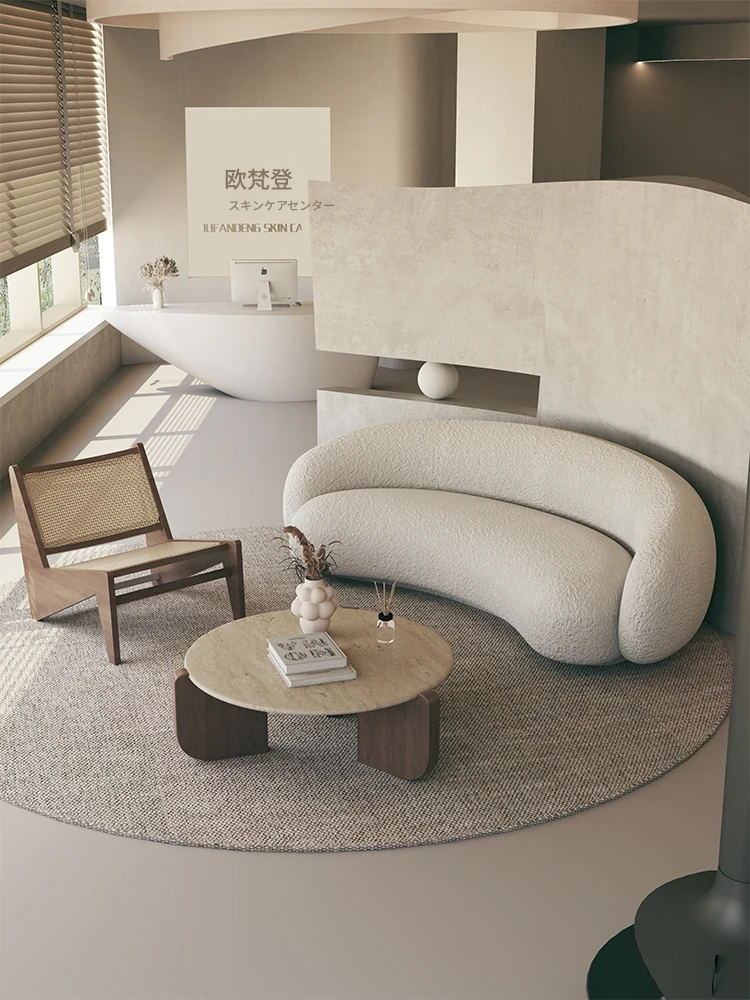 レトロな侘び寂び風の美容院にぴったり!アーチ形のカシューナッツソファは、ユニークなデザインが魅力。オフィスやホテルのロビー、休憩エリアに最適なクリエイティブな家具です。お客様を優雅にお迎えします。