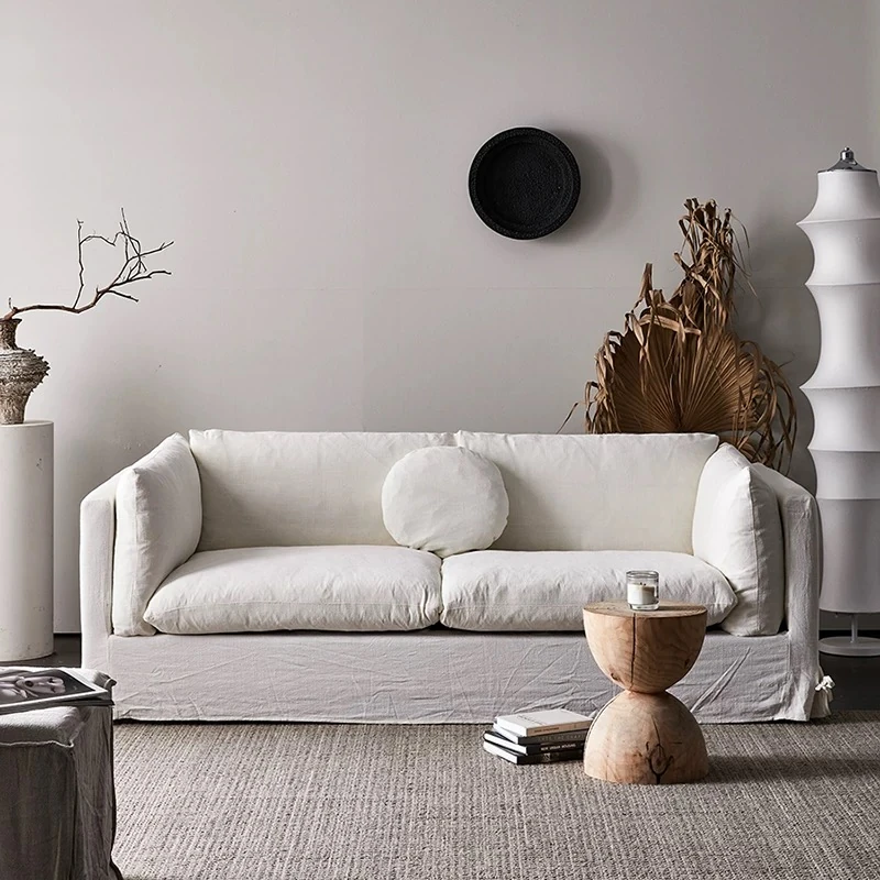 2025年新作!お洒落な侘寂スタイルの取り外し可能なリネンソファ。小型住宅に最適な3人掛け、民宿や家庭にぴったりのデザイン。心地よい空間を演出します!
