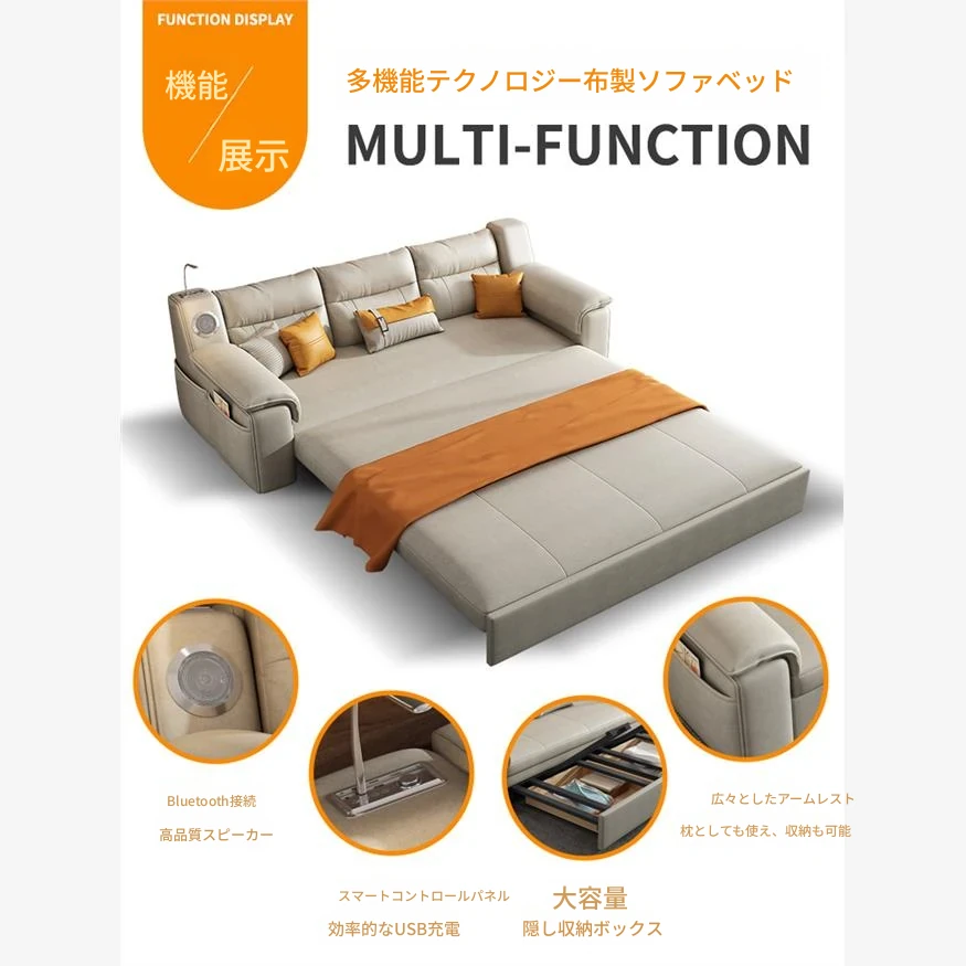 クリーム風マルチファンクション電動ソファ|リビングにも最適!寝ても座っても快適な2025年新モデル|スライド式・壁にぴったりフィットするソファベッド