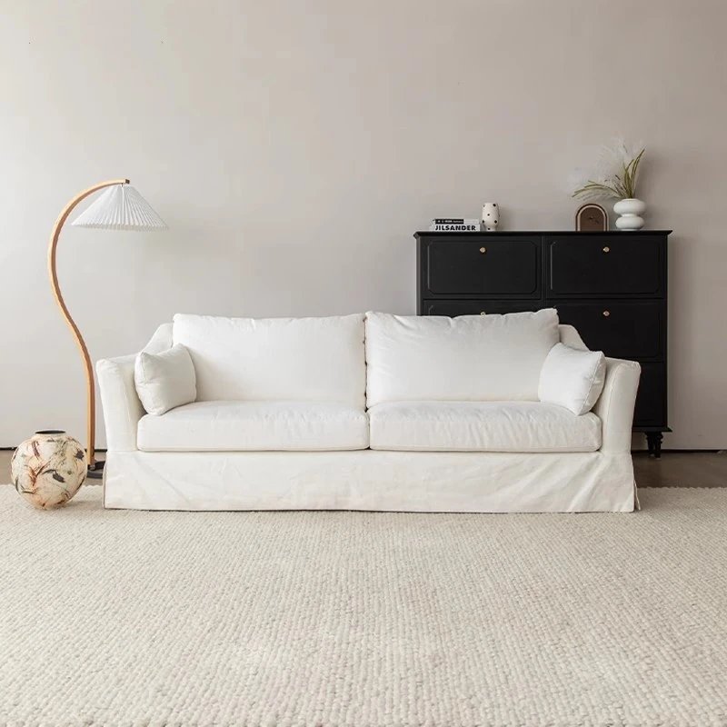中古侘寂スタイルの洗えるリネンソファ、ダウンクッション付き!小型リビングにぴったりな超ソフトなホワイト3人掛け、民宿にも最適。心地よい空間を演出します!