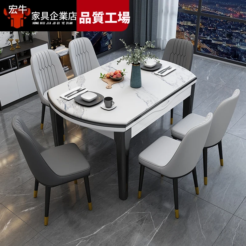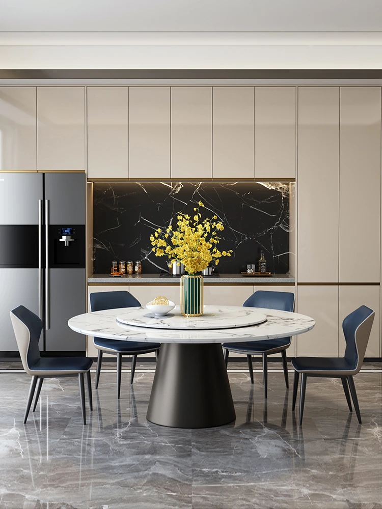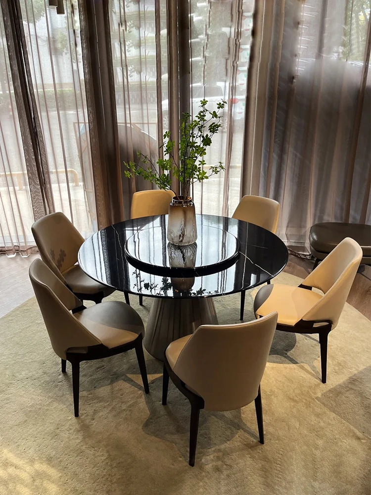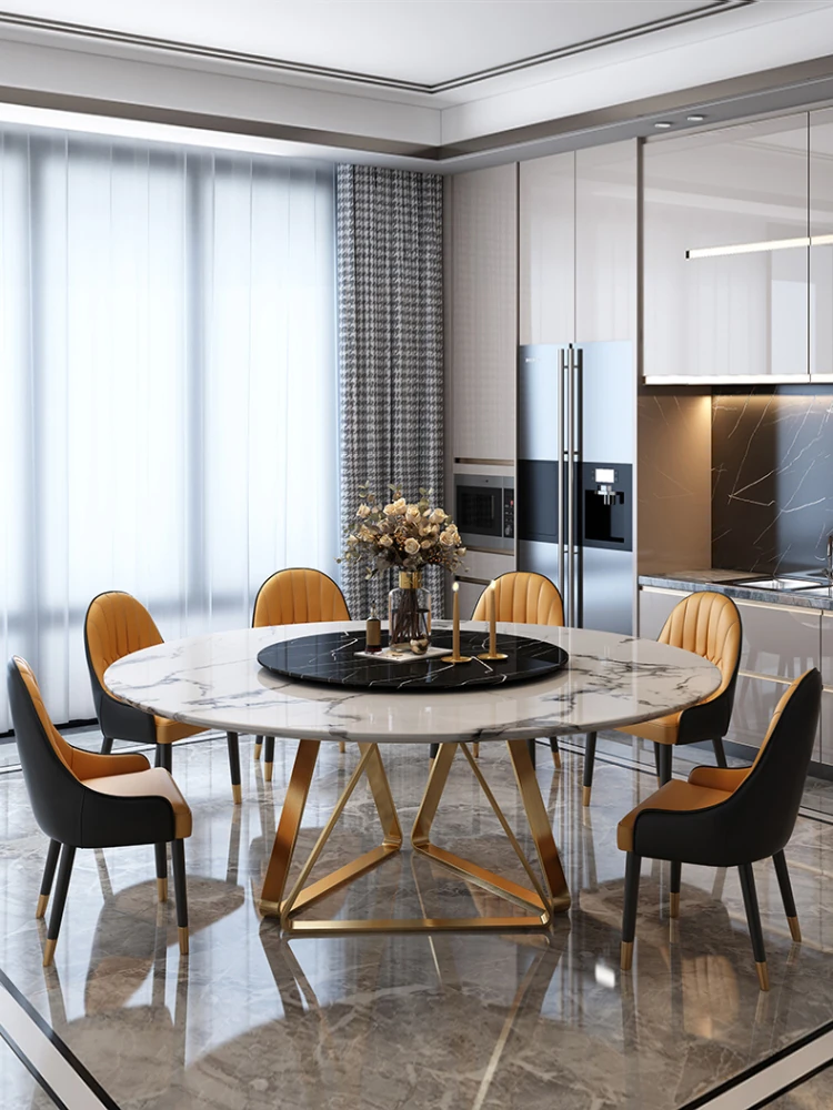 香港スタイルの軽奢大理石ラウンドテーブル、回転式、家庭用ダイニングテーブル&チェアセット、モダン北欧INS風、ホテルにも最適、1.8メートルのスタイリッシュなデザイン!