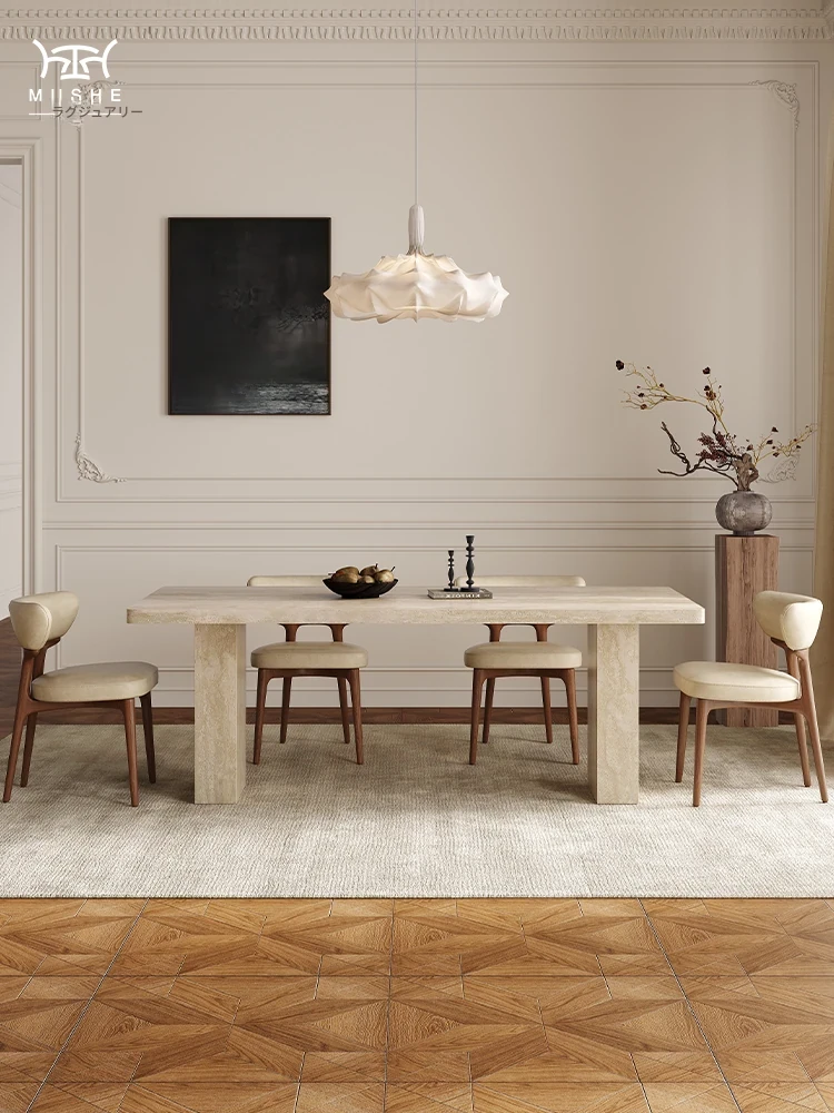 中古風洞石ダイニングテーブル 大型向け 創造的デザイン フレンチスタイルの岩板製 テーブル&チェアセット 家庭用 レストランの食事に最適!スタイリッシュでユニークな空間を演出します。