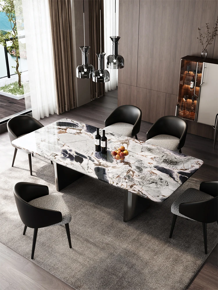 輸入された古木目調の豪華な大理石ダイニングテーブル - モダンでシンプルな別荘スタイルの長方形テーブル。極限のミニマリズムを追求した家庭用ダイニングテーブルで、優雅な食事空間を演出します。
