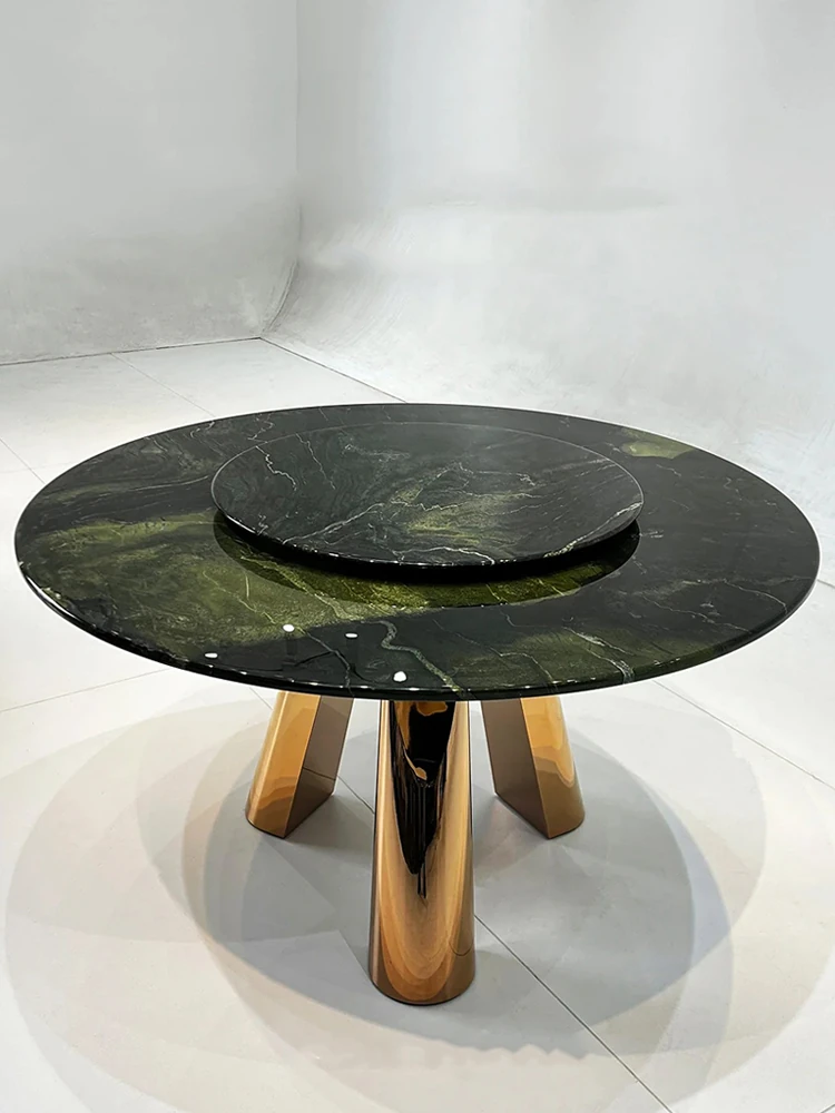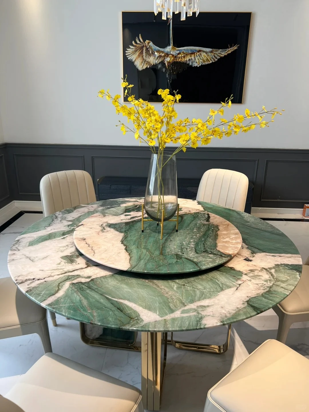 輸入された天然高級石材を使用したアボカドグリーンの丸いダイニングテーブル。高級イタリアンスタイルの洗練されたデザインと回転式プレート付きで、別荘にぴったりのエレガントな大理石テーブルです。