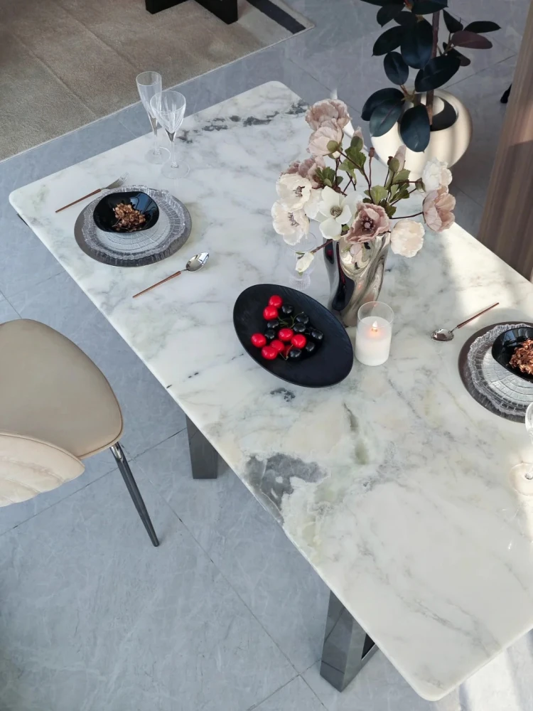 イタリアンスタイルのラグジュアリー大理石ダイニングテーブル|モダンでシンプルなデザイン|広々とした別荘や大きな家に最適な高級家具|優雅な食事空間を演出します!