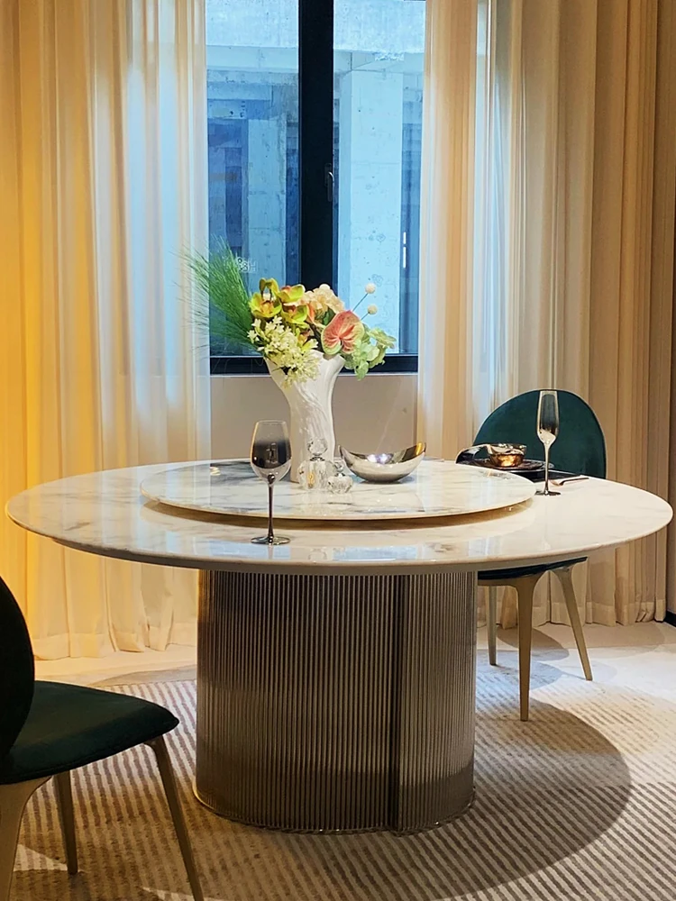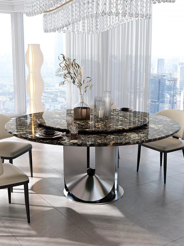 イタリアンラグジュアリー大理石ダイニングテーブルセット - 1.8m/2m円形テーブル、回転式、10人用、家庭用・ホテル用に最適!美しさと機能性を兼ね備えた上質な家具で、特別なひとときを演出します。