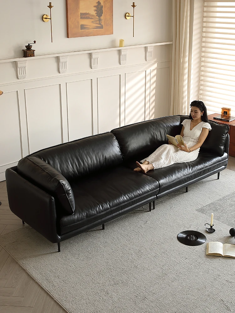 Black Diamond Italian Minimalist Top Grain Leather Sofa - Vintage Black Designer Living Room Sofa for Home, Streamlined Design