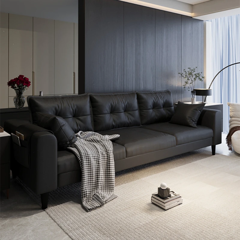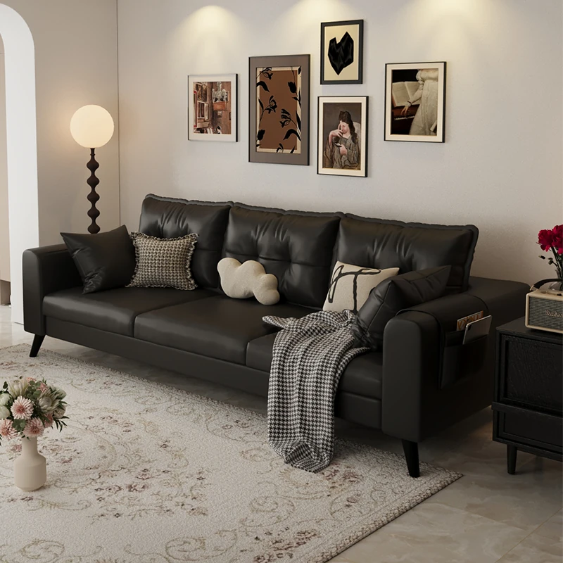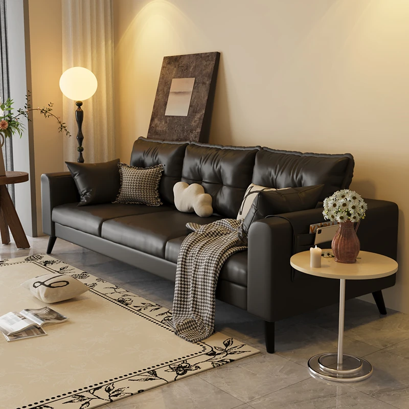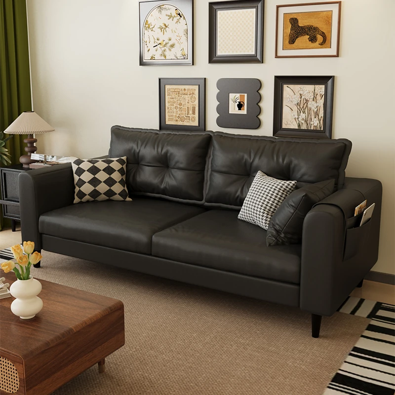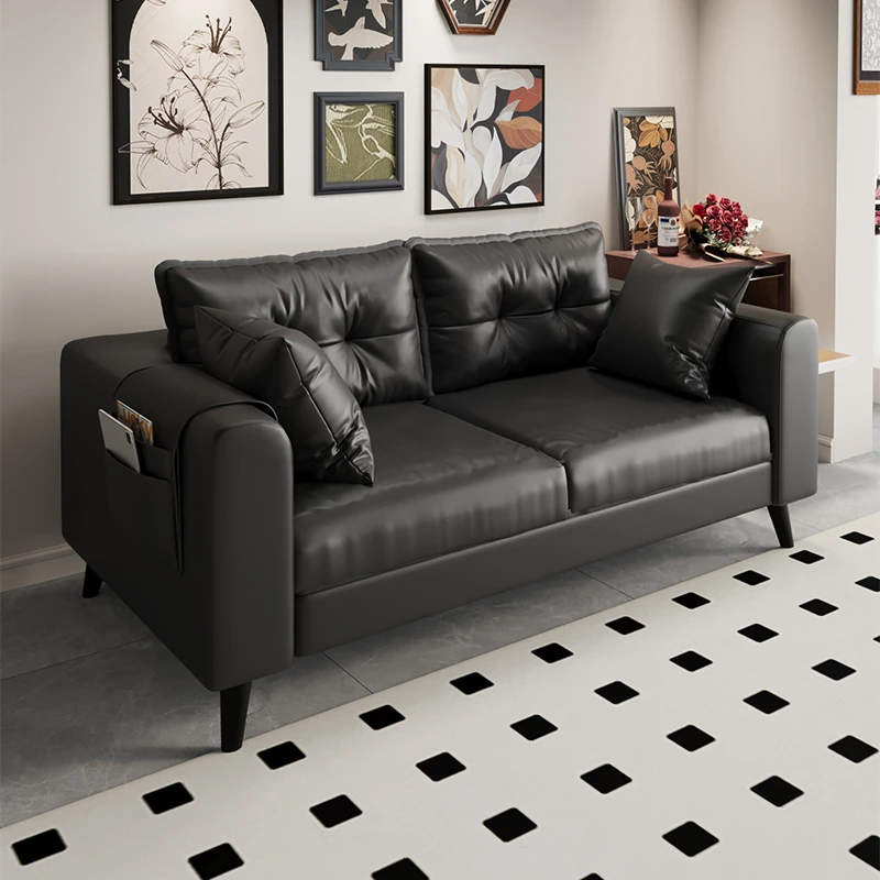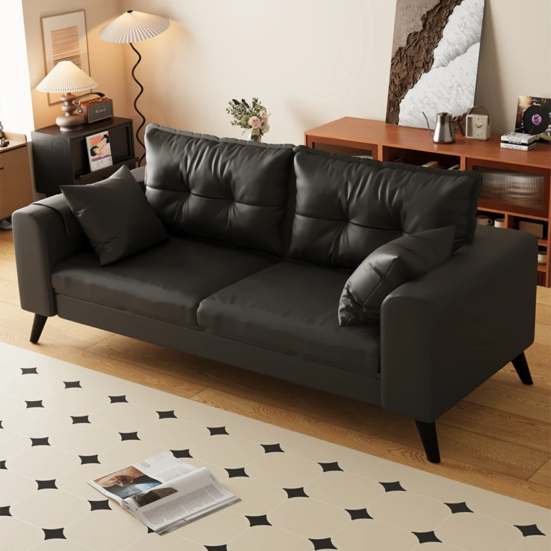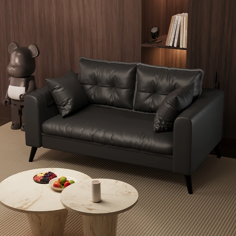 Modern Minimalist Black Leather Sofa for Small Living Rooms - Vintage Style Two-Seater and Three-Seater Lounge Sofa for Cozy Bedrooms and Relaxation