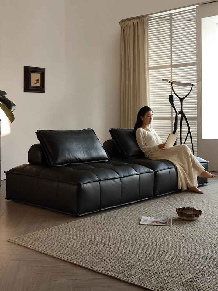 Piedmont Designer Black Italian Minimalist Tofu Block Modular Sofa - Crafted from Full-Grain Leather for Ultimate Comfort and Style