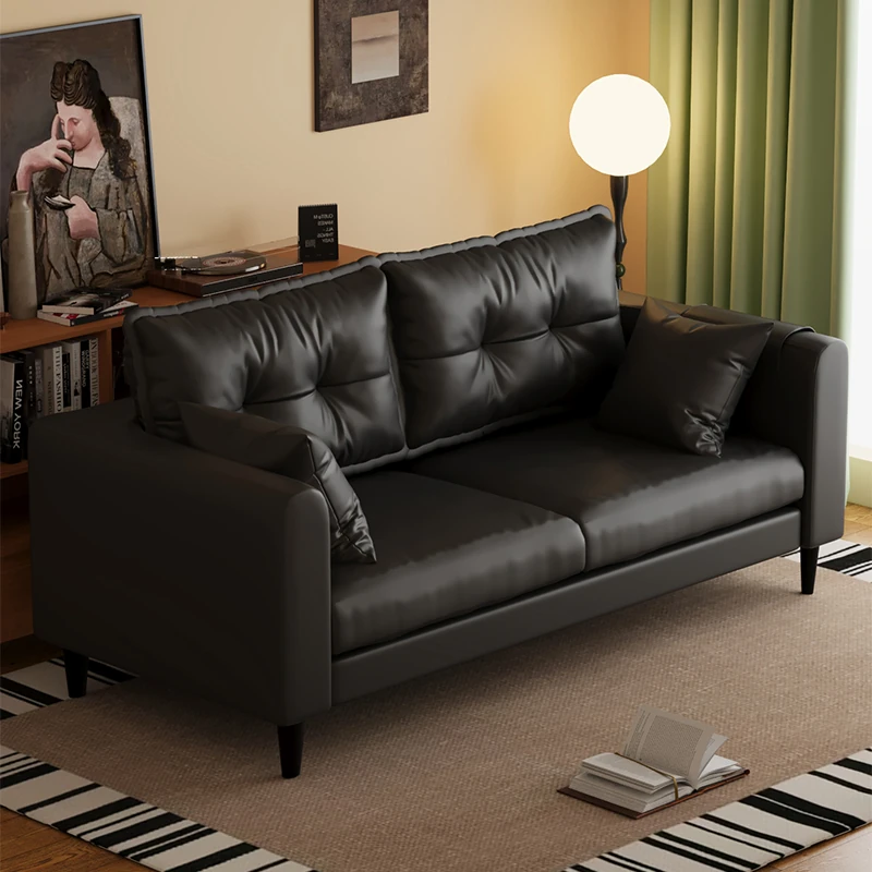 Modern Minimalist Black Faux Leather Sofa for Small Apartments - Stylish Mid-Century 2-Seater Couch for Living Room and 3-Seater Lazy Bed Sofa for Bedroom