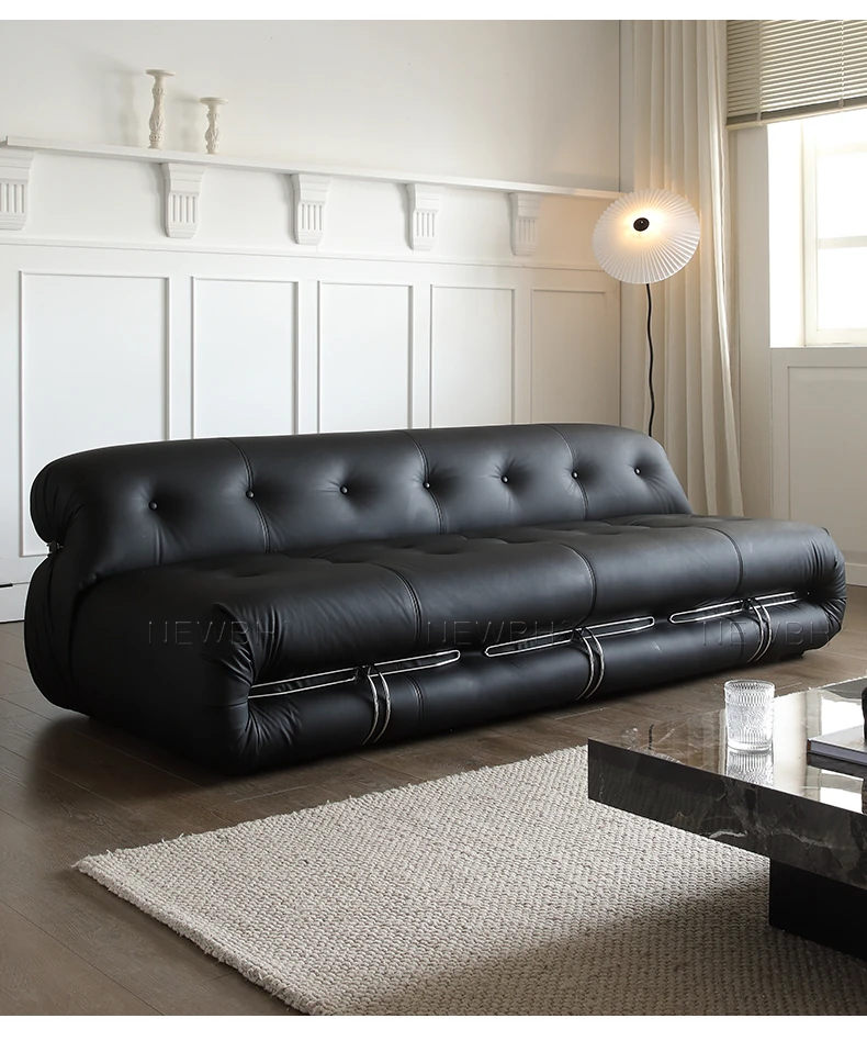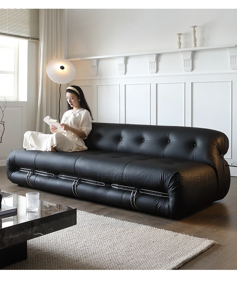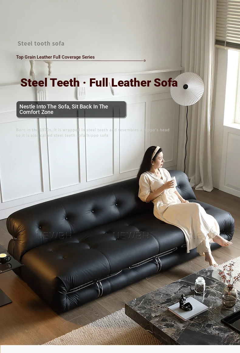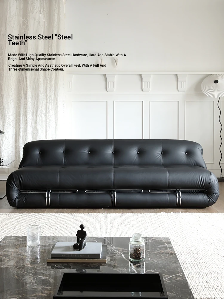 Designer Cassina Hippo Steel-toothed Full Grain Leather Sofa - Black, Straight Line 3-Seater Living Room Sofa for Modern Elegance and Comfort