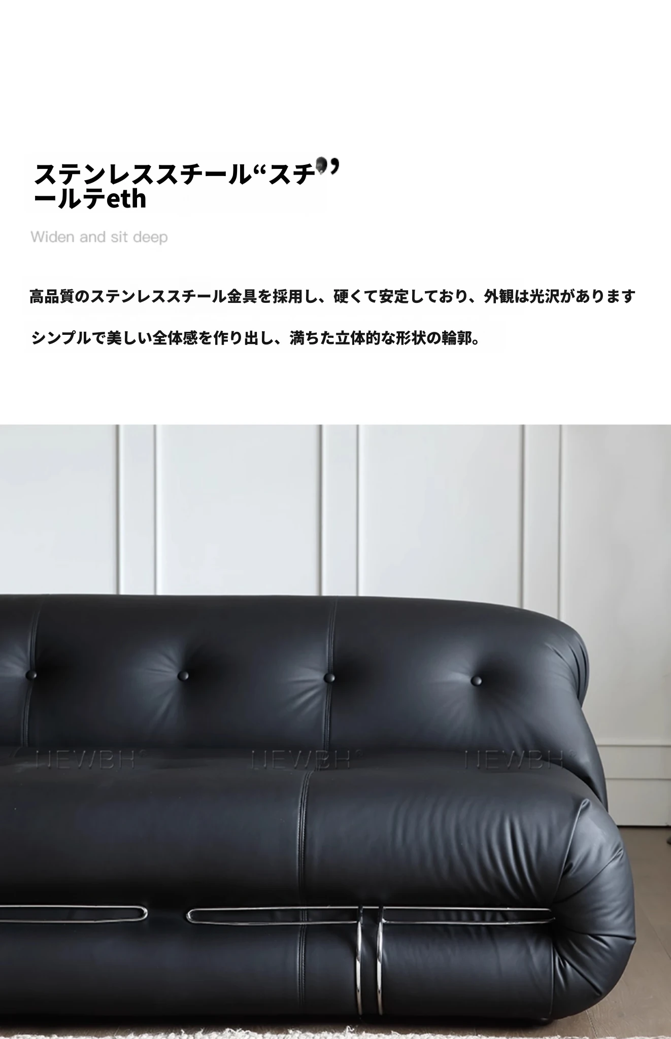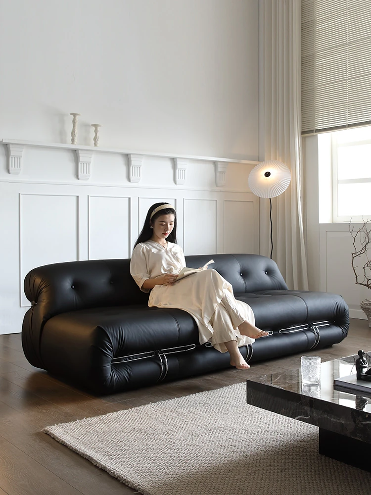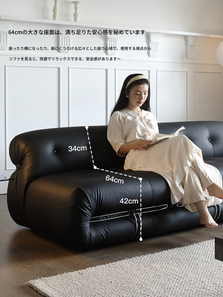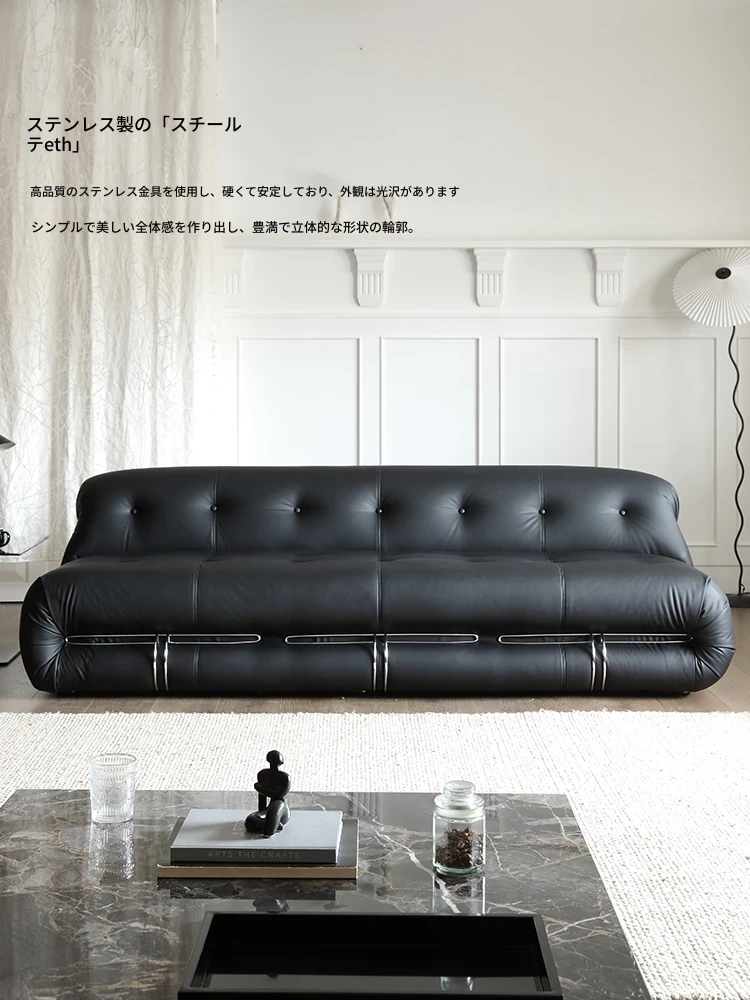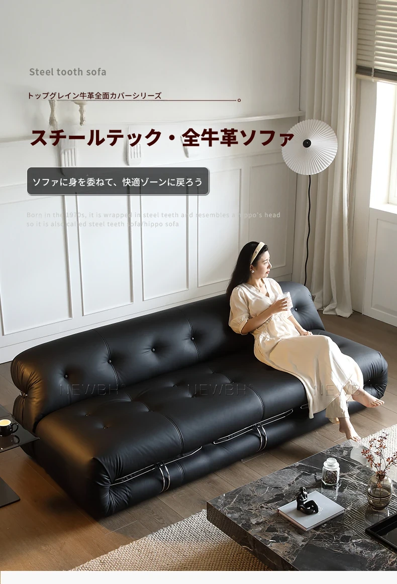 デザイナーCassinaのヒッポ鋼歯フルレザーソファ、ブラックカラーのストレートタイプ3人掛けリビングソファ。高級感あふれるデザインで、居心地の良い空間を演出します。あなたのリビングに最適なスタイルを提供!