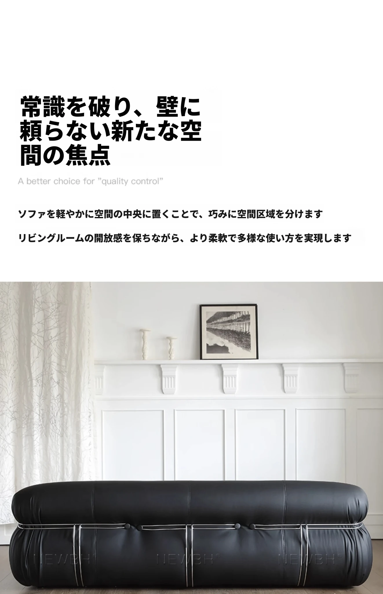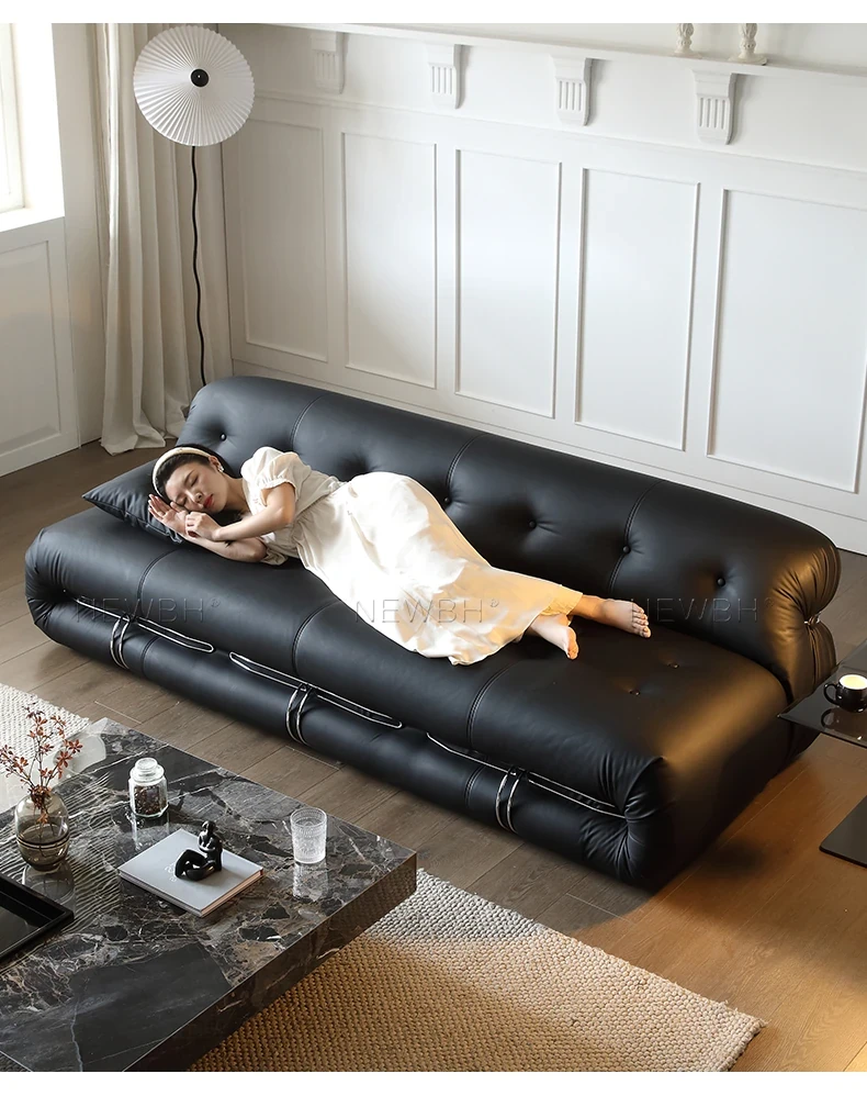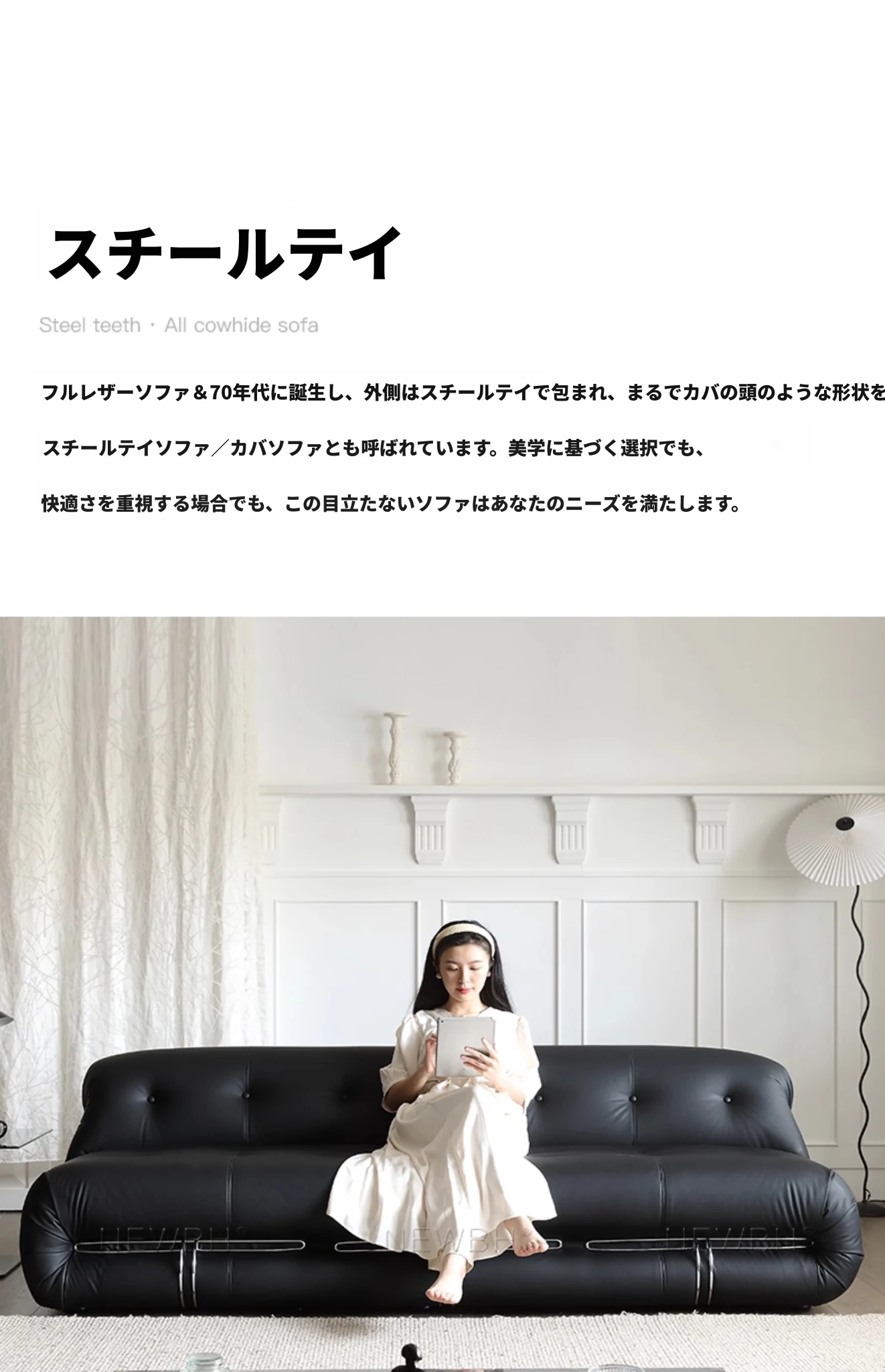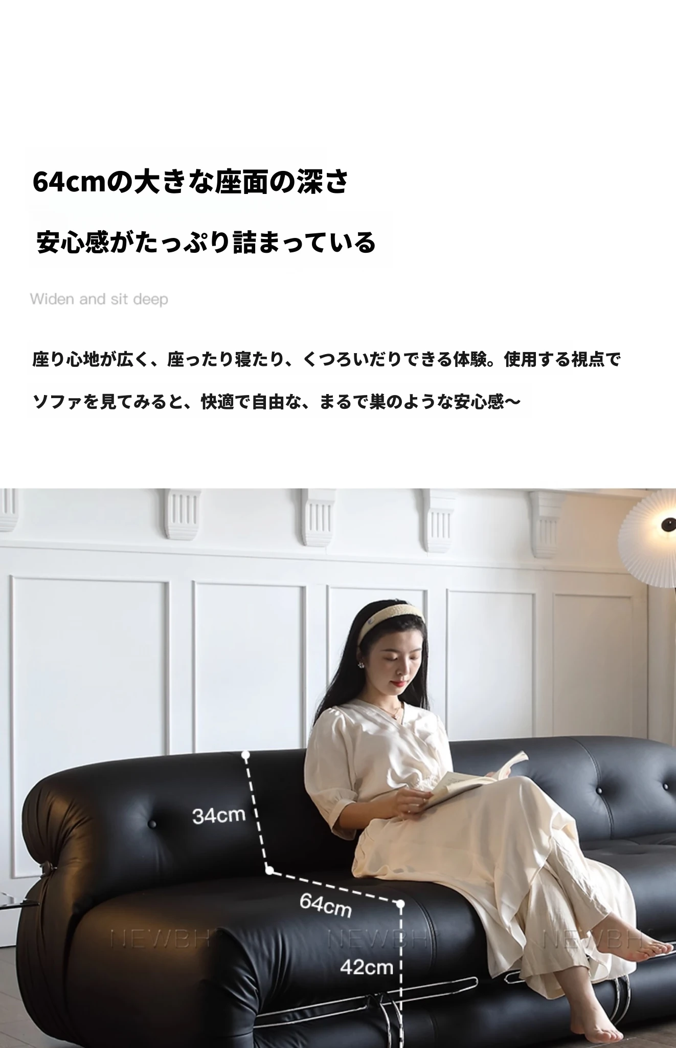 デザイナーCassinaのヒッポ鋼歯フルレザーソファ、ブラックカラーのストレートタイプ3人掛けリビングソファ。高級感あふれるデザインで、居心地の良い空間を演出します。あなたのリビングに最適なスタイルを提供!
