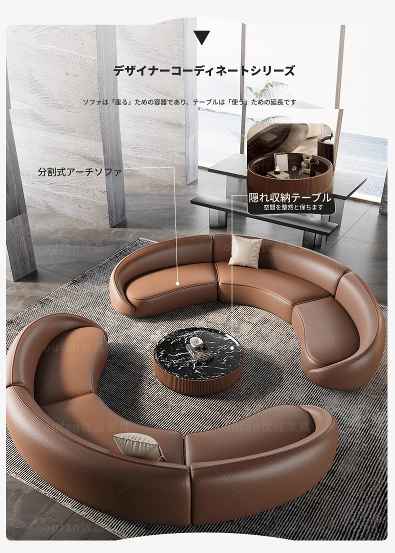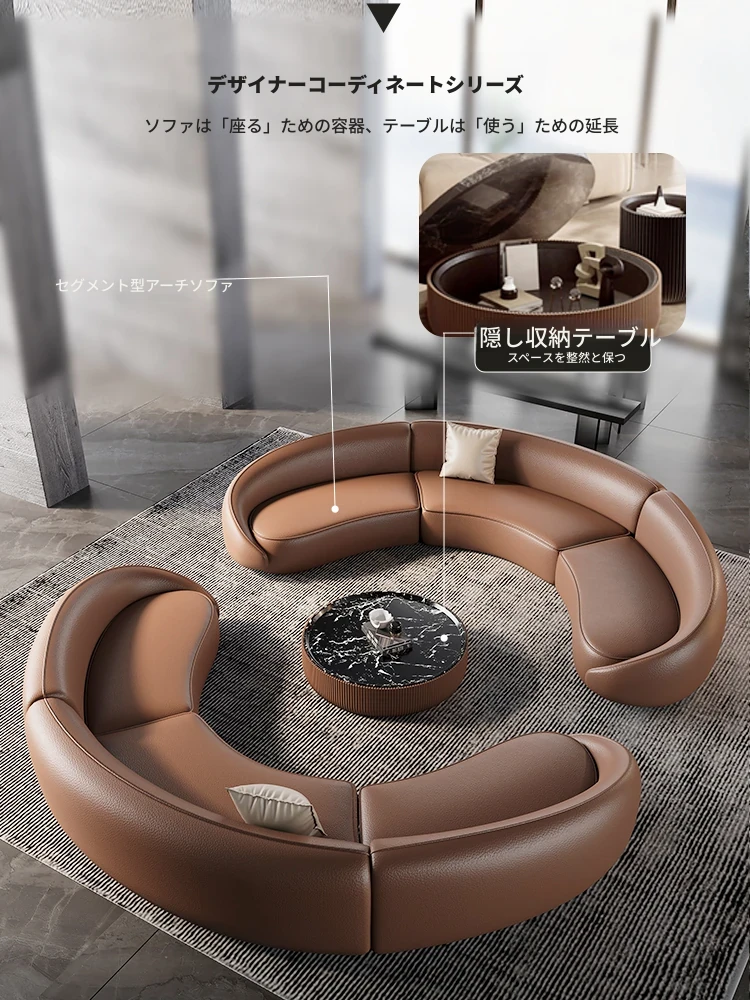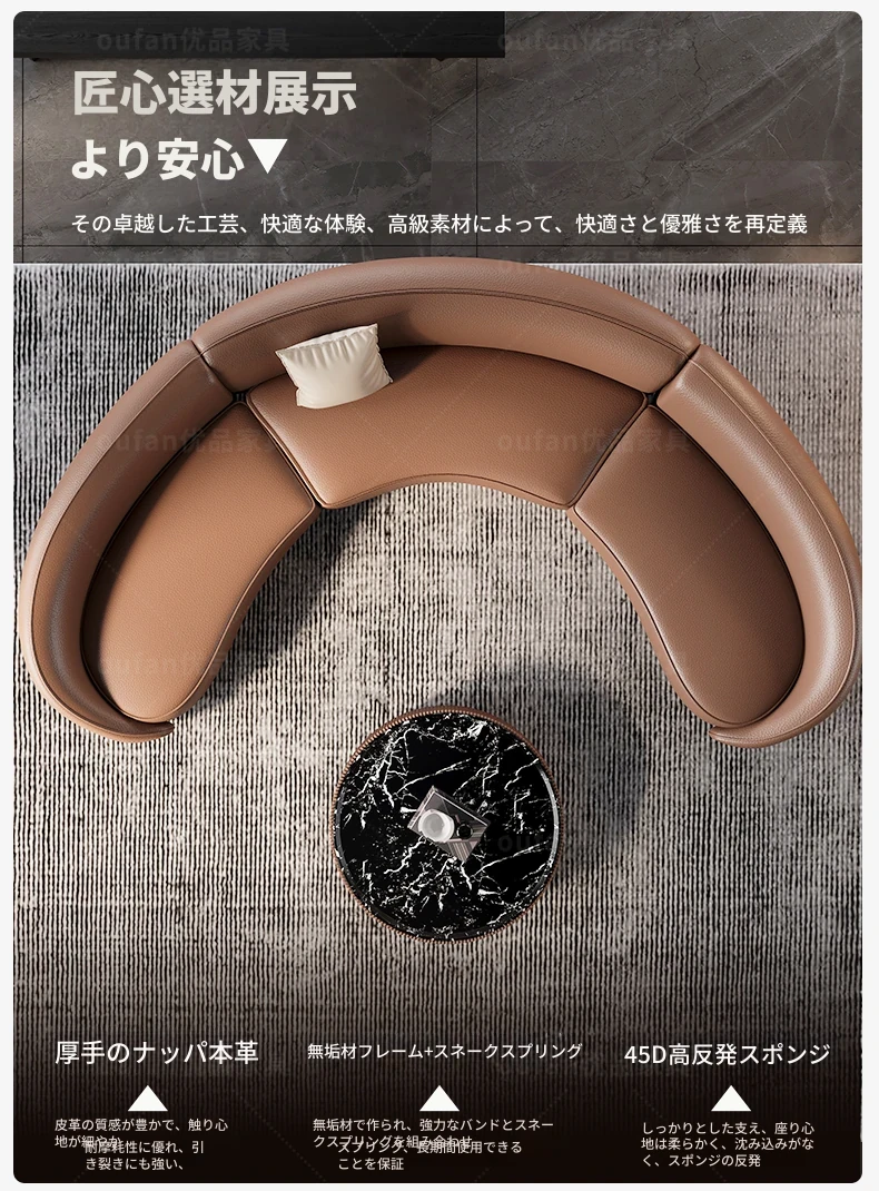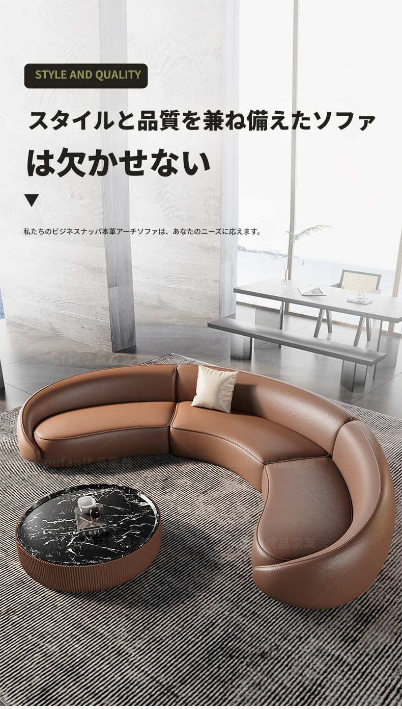 デザイナーによる半円形ユニークソファ - 美容院・販売所・ホテルロビーの待機・受付エリアに最適!洗練されたデザインで、居心地の良い空間を演出します。お客様を魅了するスタイリッシュなインテリアの必需品!