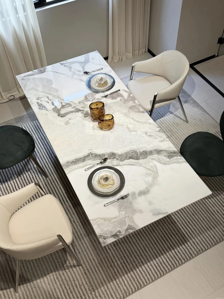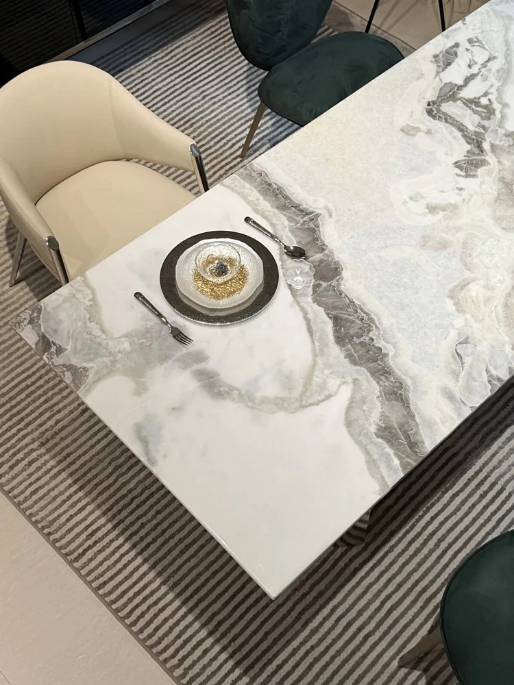 イタリアンラグジュアリーの洗練されたオフィス用フィンディホワイトダイニングテーブル - シンプルでモダンな高級感溢れる長方形のラグジュアリーストーンダイニングテーブル。