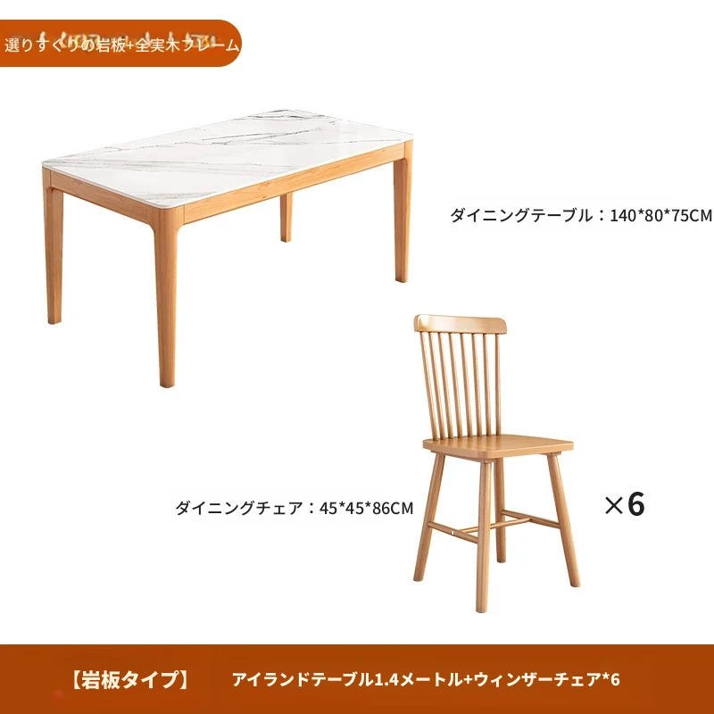 島台ダイニングテーブル1.4メートル+ウィンザーチェア*6【輸入岩板】 原木色