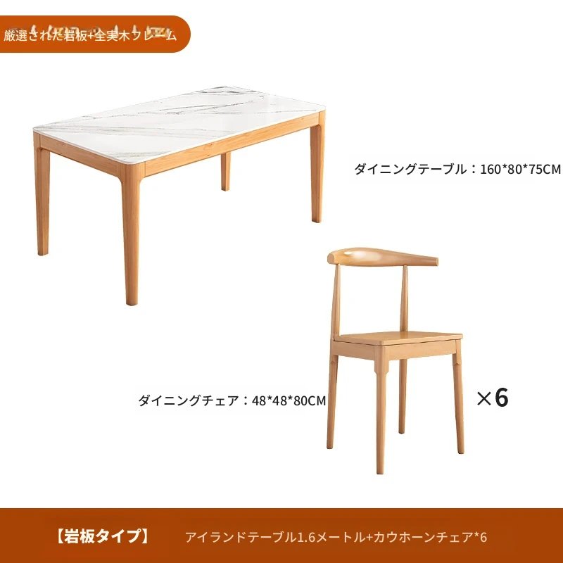 島台ダイニングテーブル1.6メートル+角椅子*6【輸入岩板】 原木色