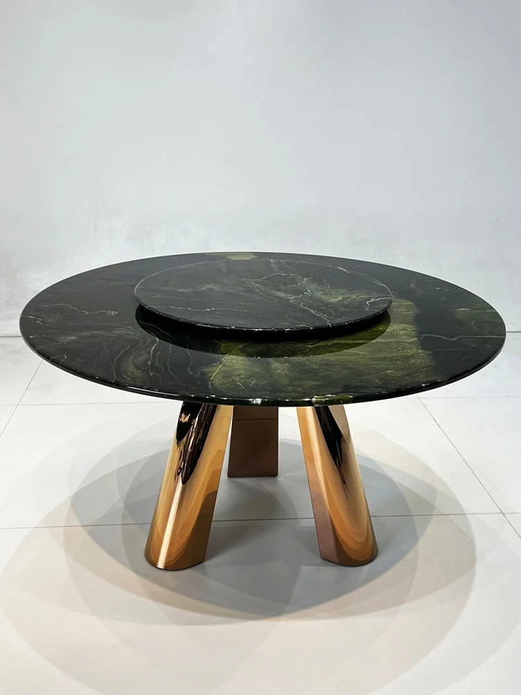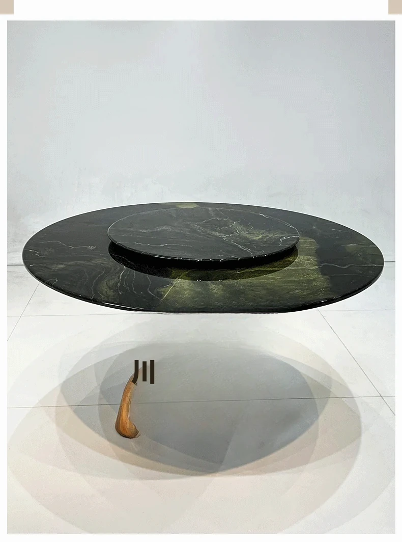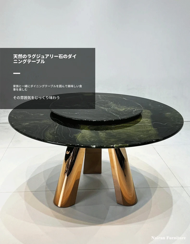 輸入された天然高級石材を使用したアボカドグリーンの丸いダイニングテーブル。高級イタリアンスタイルの洗練されたデザインと回転式プレート付きで、別荘にぴったりのエレガントな大理石テーブルです。