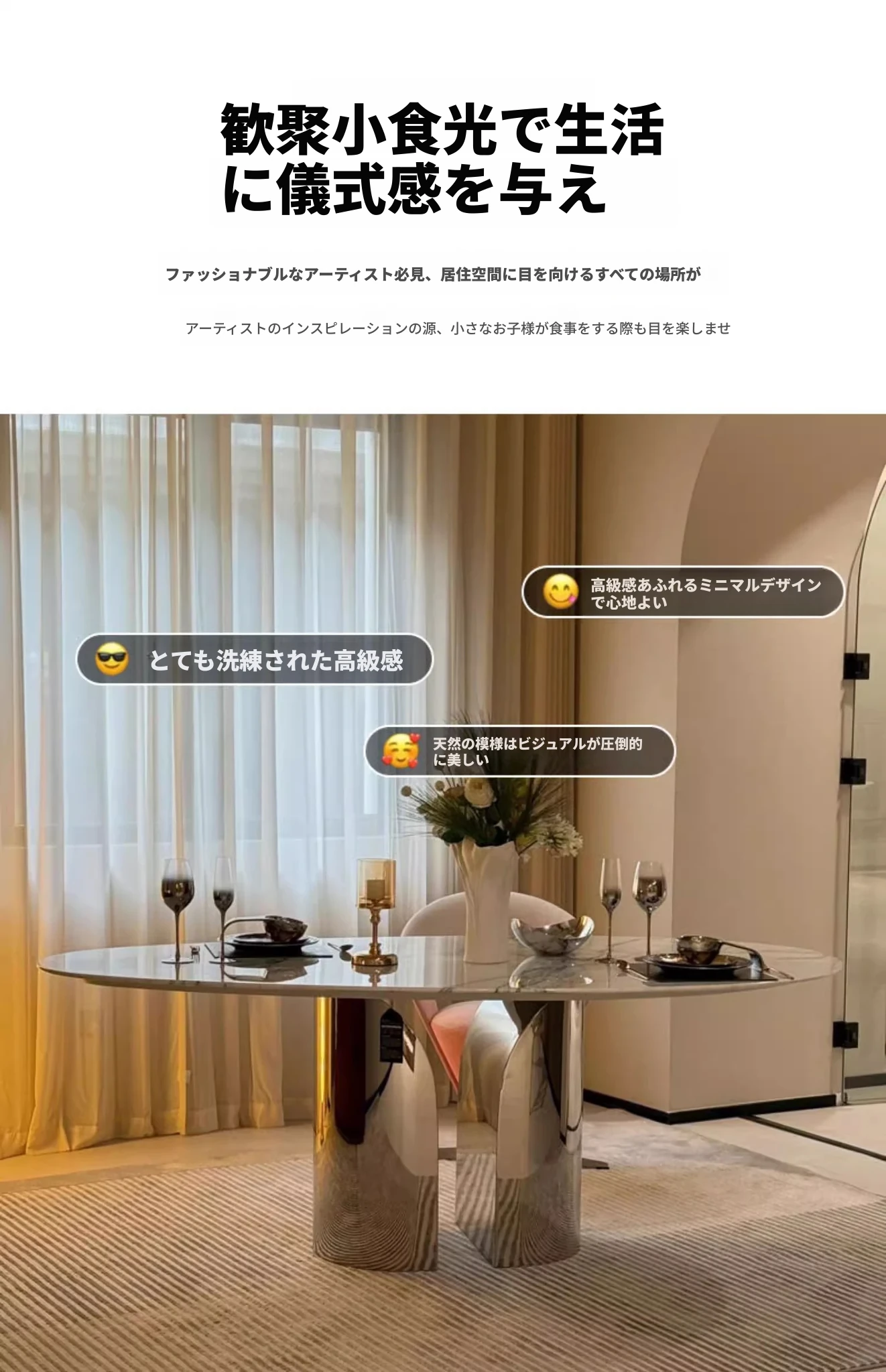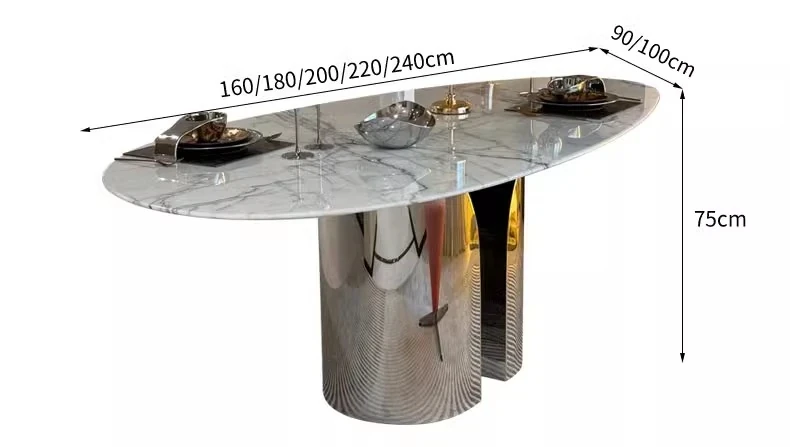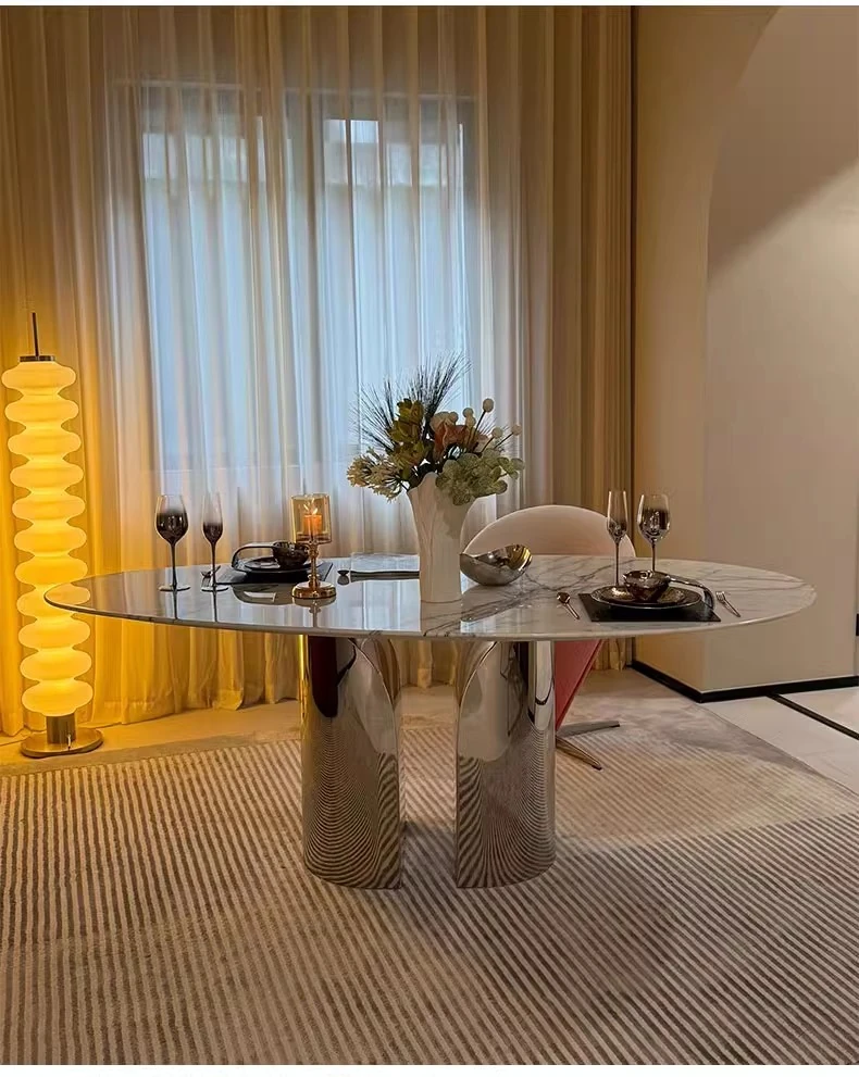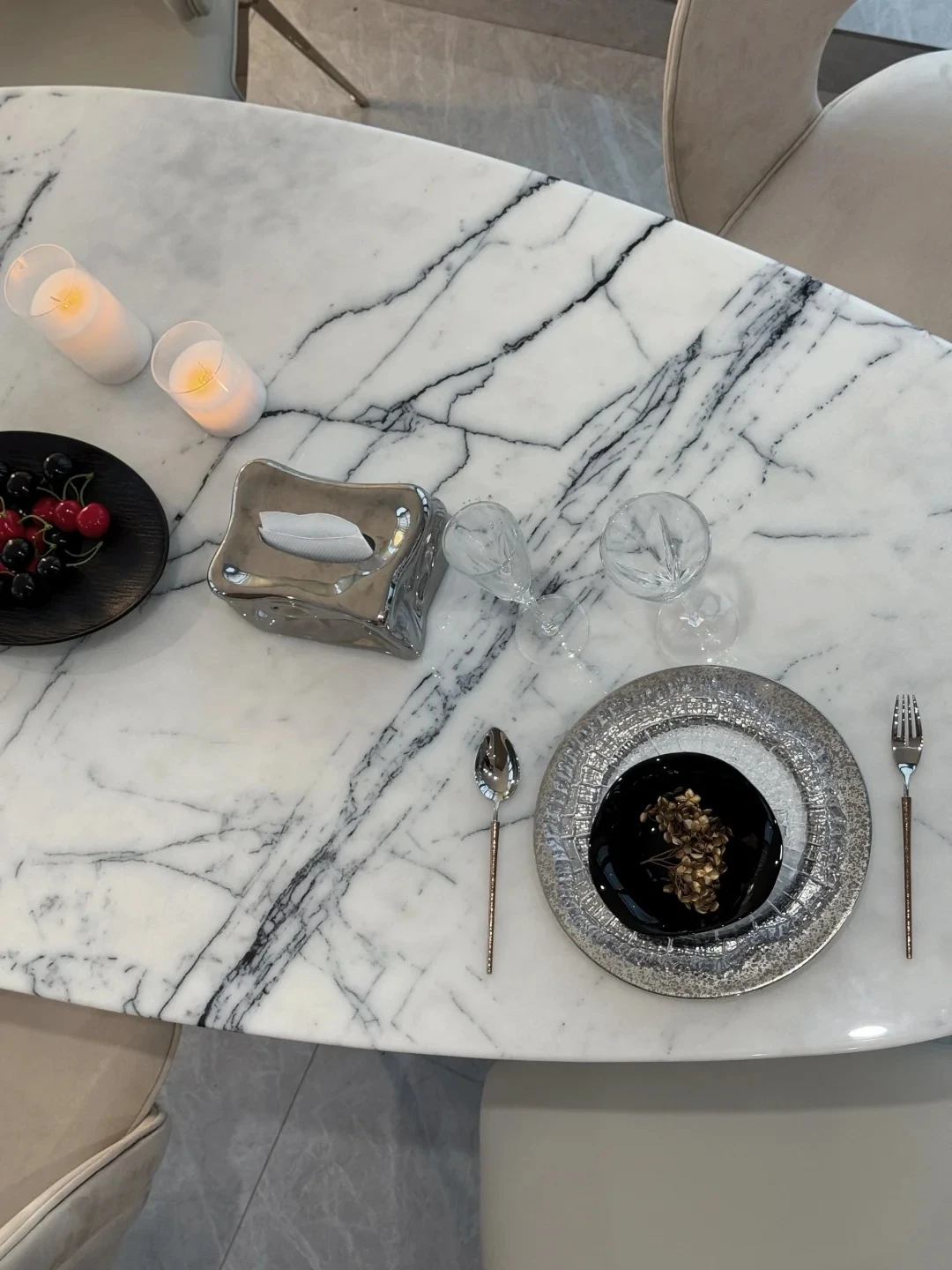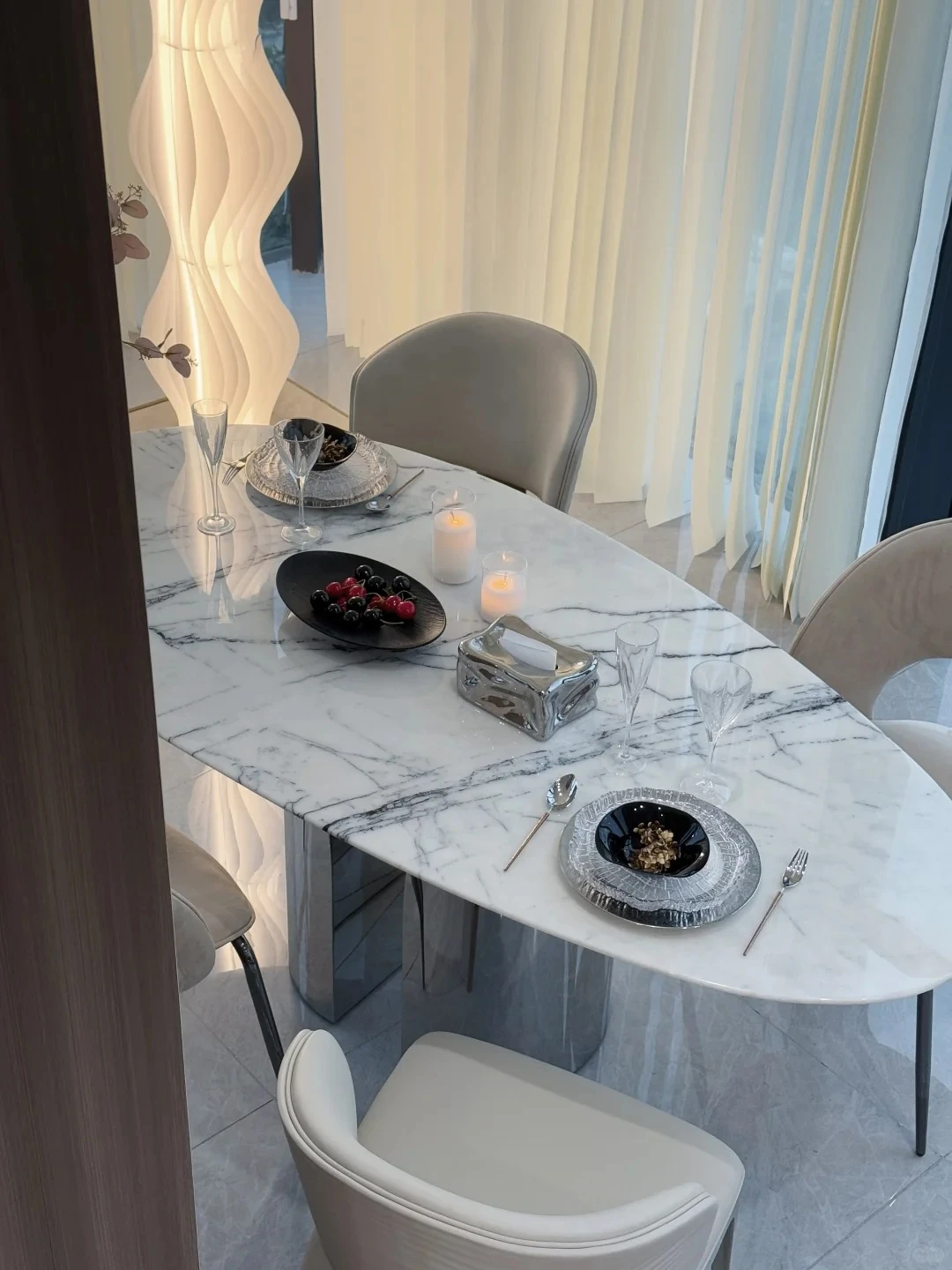 輸入天然高級石材の香雪梅大理石ダイニングテーブル - イタリアンミニマリズムの極み、別荘や家庭に最適なエレガントな楕円形テーブル!