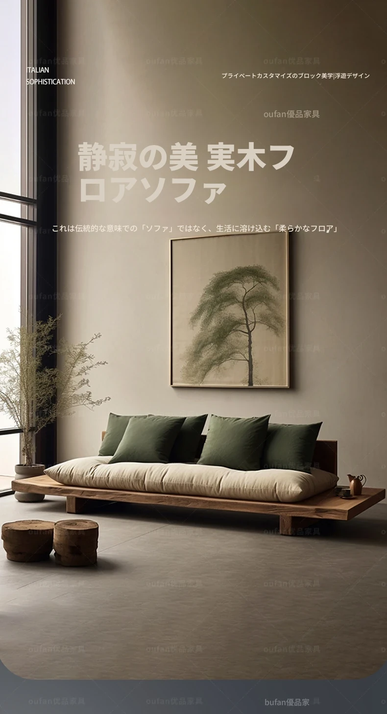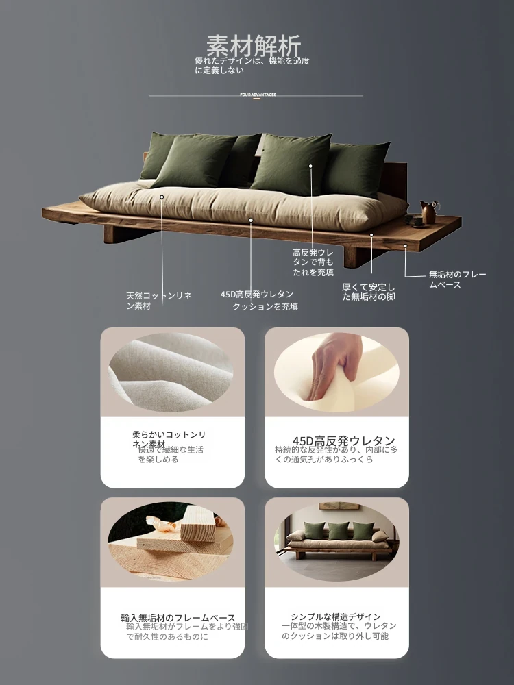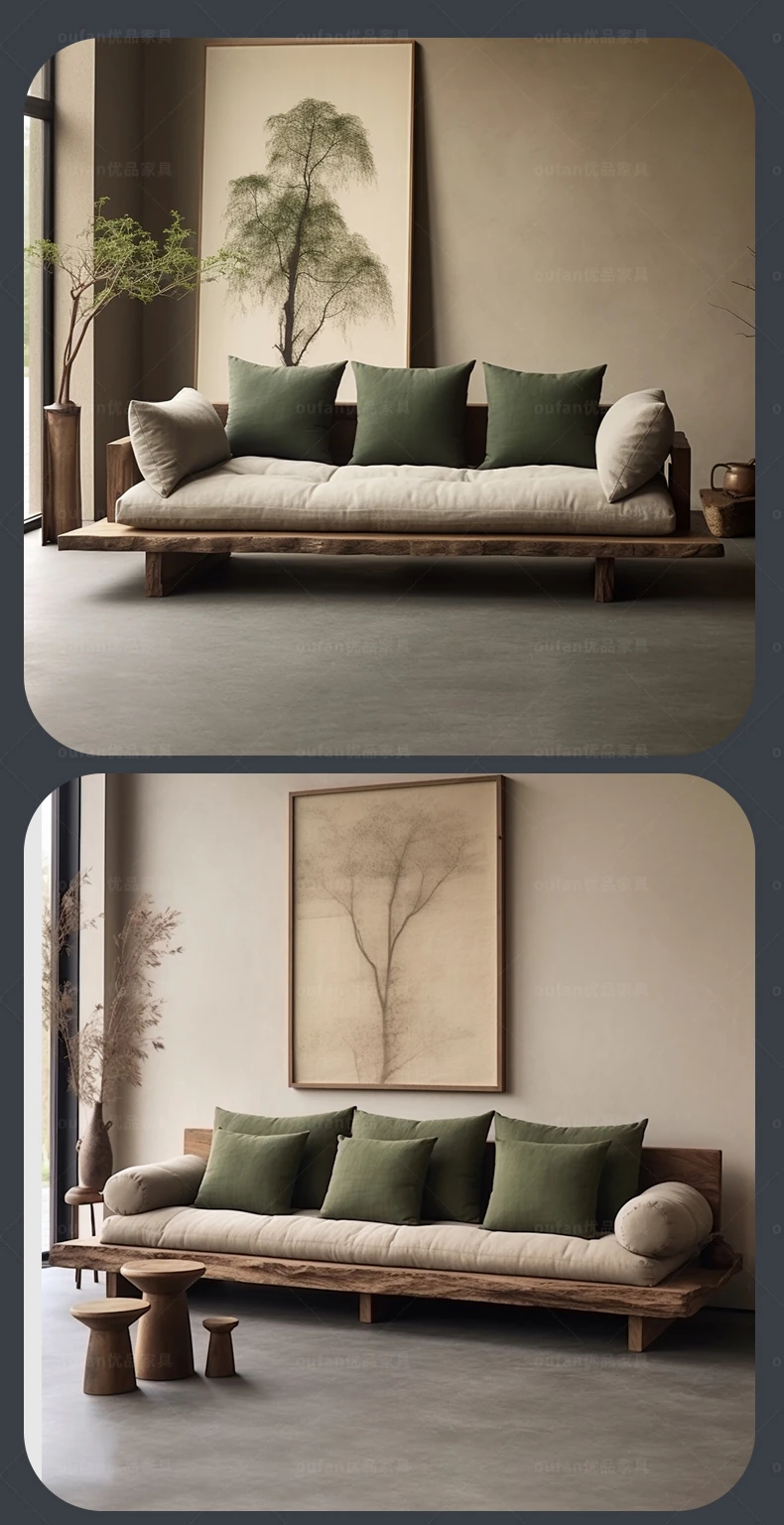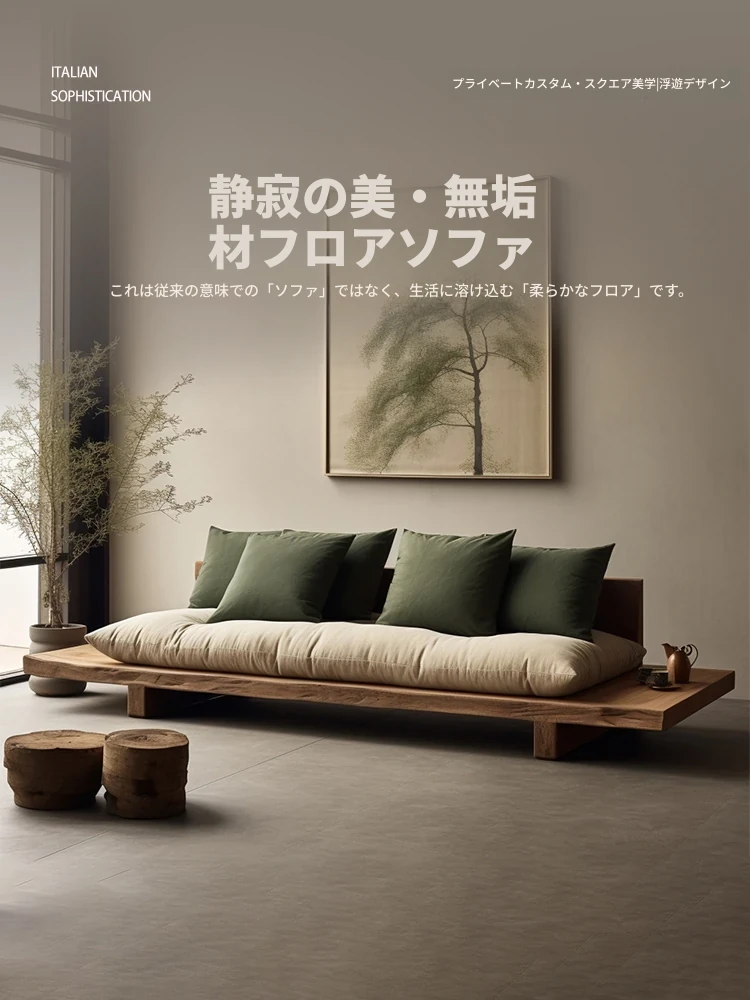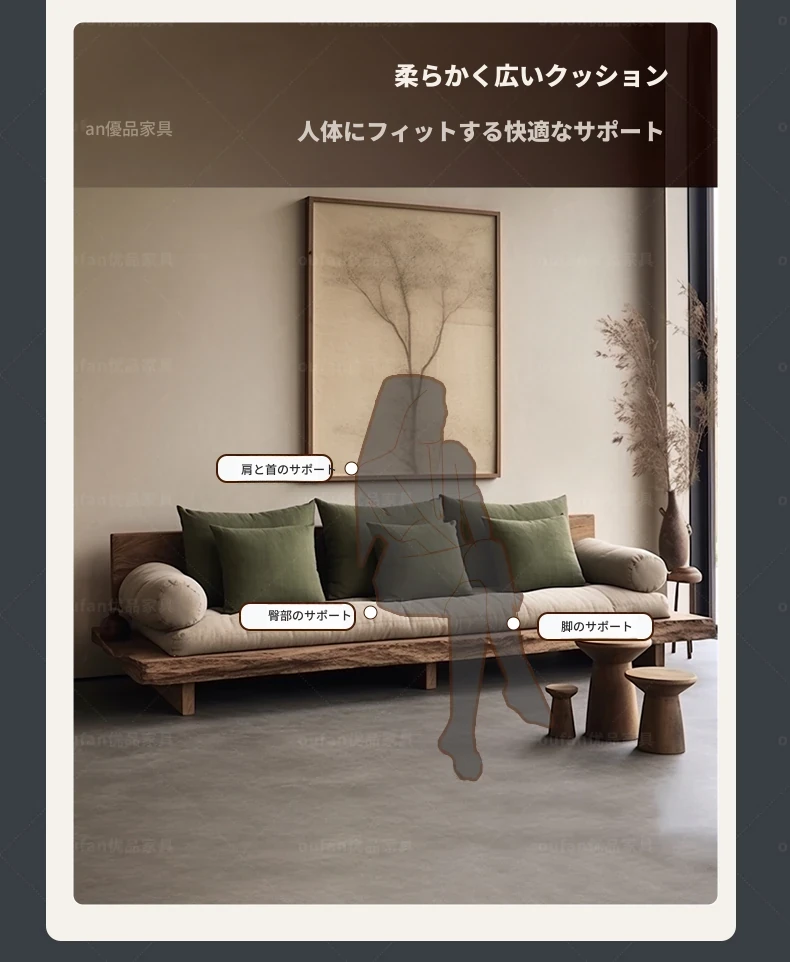 和の趣を感じる侘寂風実木ソファ - シンプルでおしゃれな原木デザイン!小型のリビングや民宿にぴったりの2人掛け・3人掛けソファ。空間を優雅に彩る、心安らぐひとときを提供します。