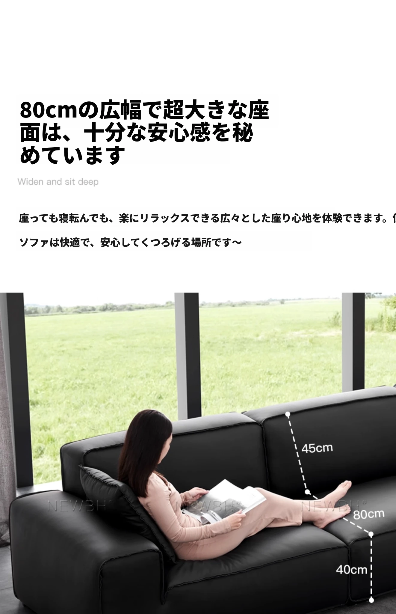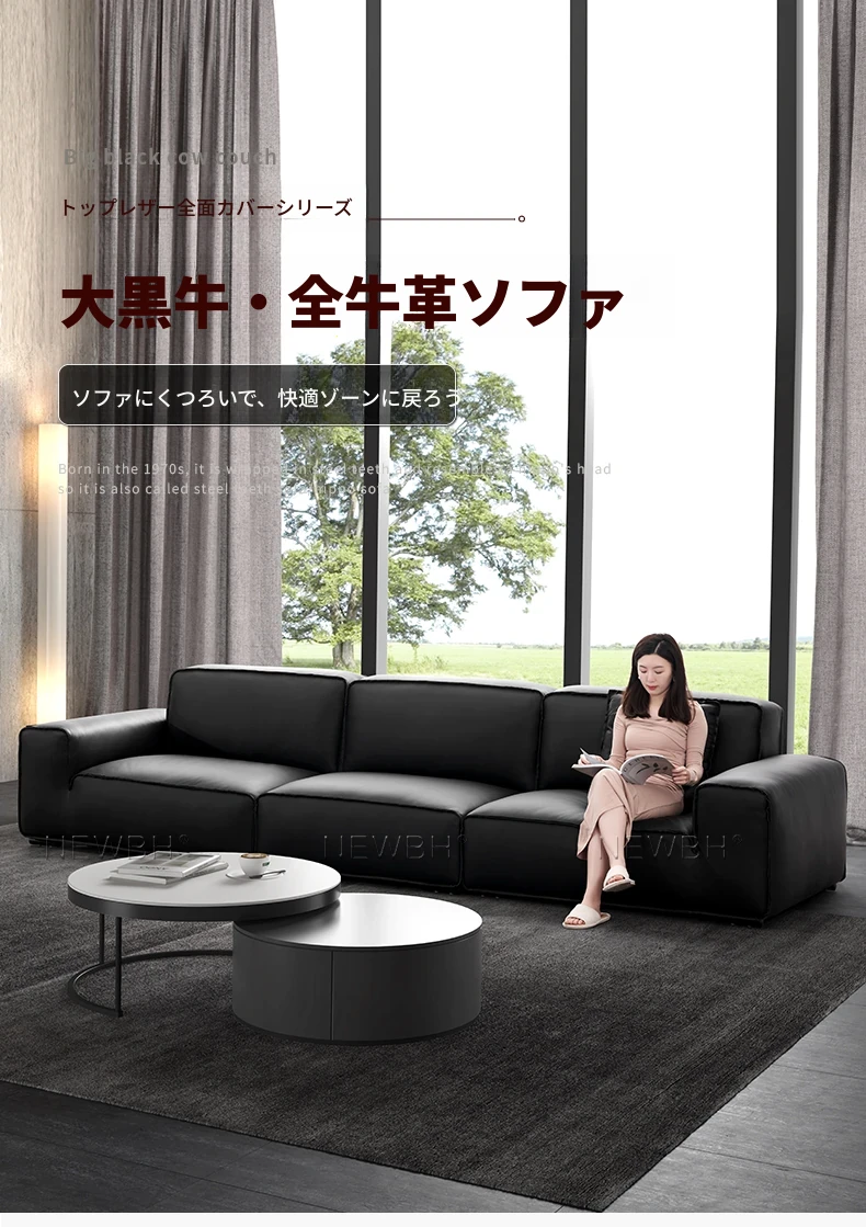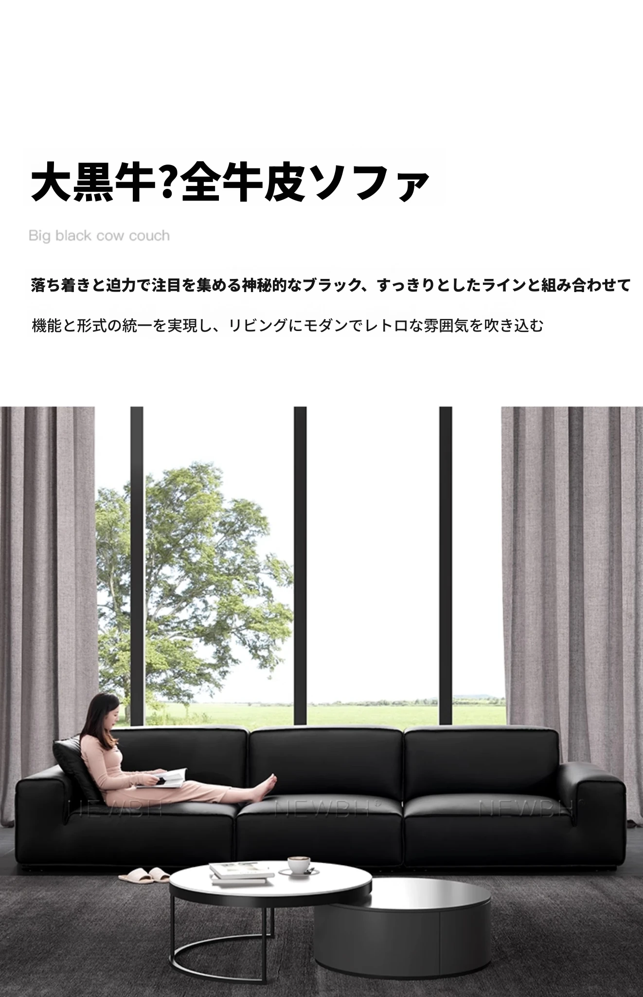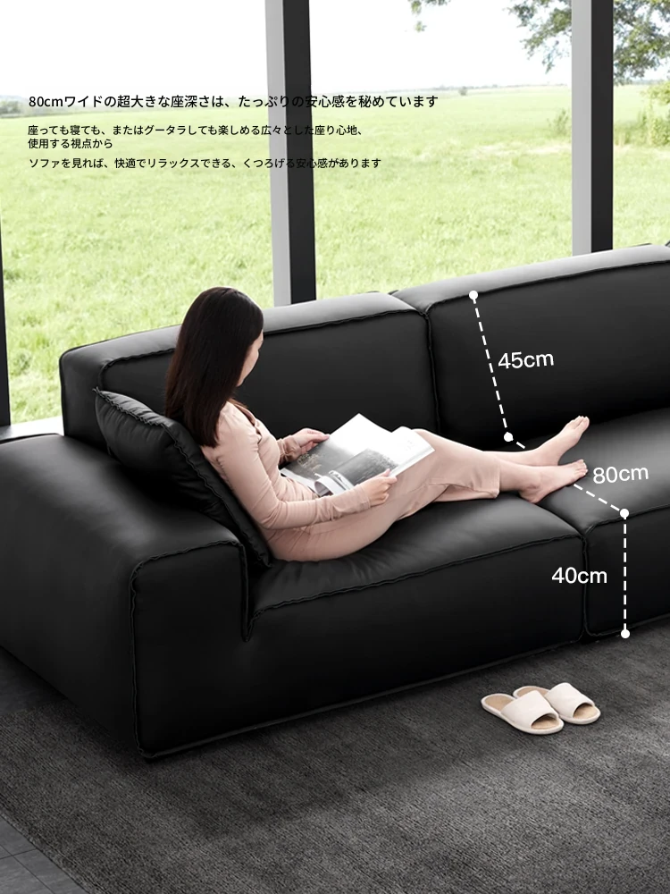 ブラックビッグレザーソファ|高級本革使用のモダンデザイン|ラテックス仕上げで快適さを追求|シンプルでスタイリッシュなリビングに最適な豆腐ブロック型ソファ