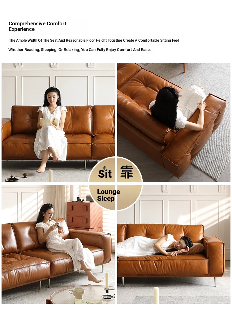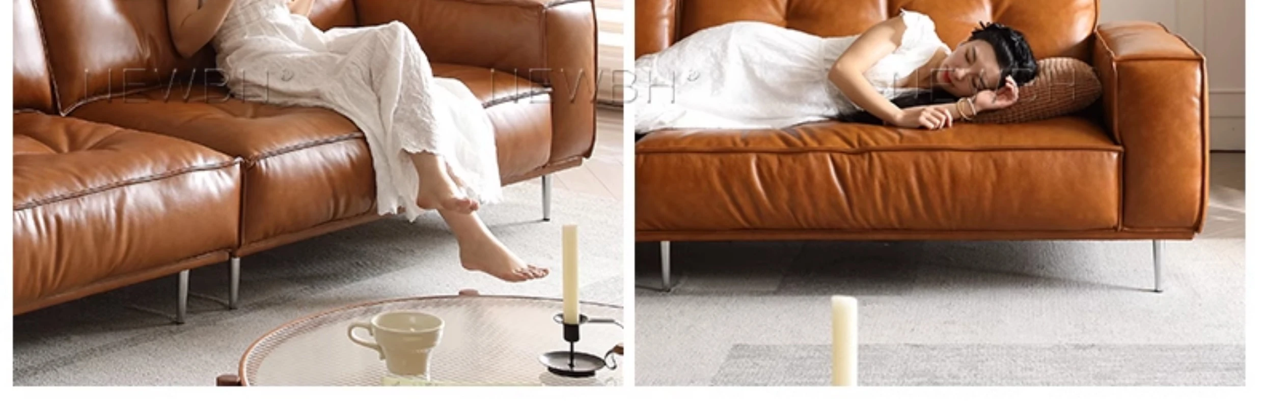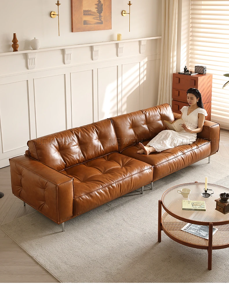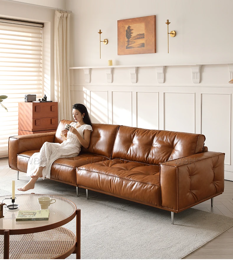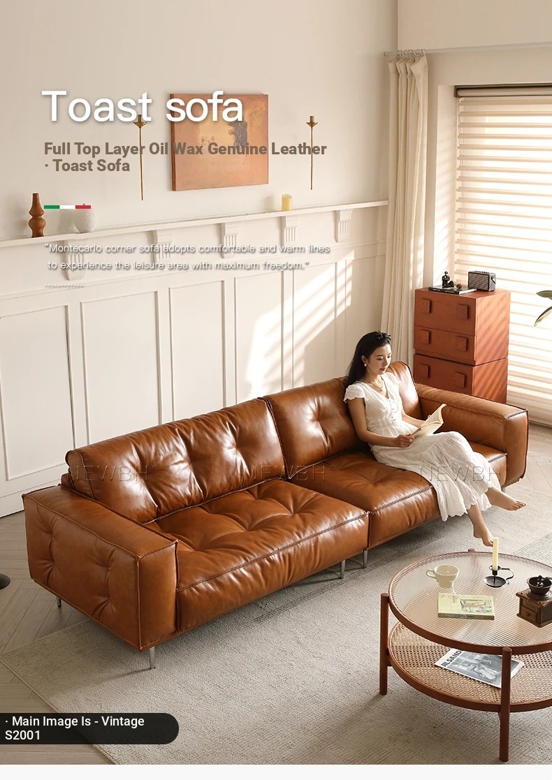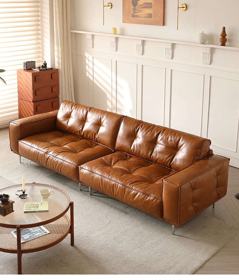 Vintage Designer Leather Sofa for Toasted Bread Style Living Room - Full Grain Waxed Leather, Perfect for Small and Large Spaces, Straight Design