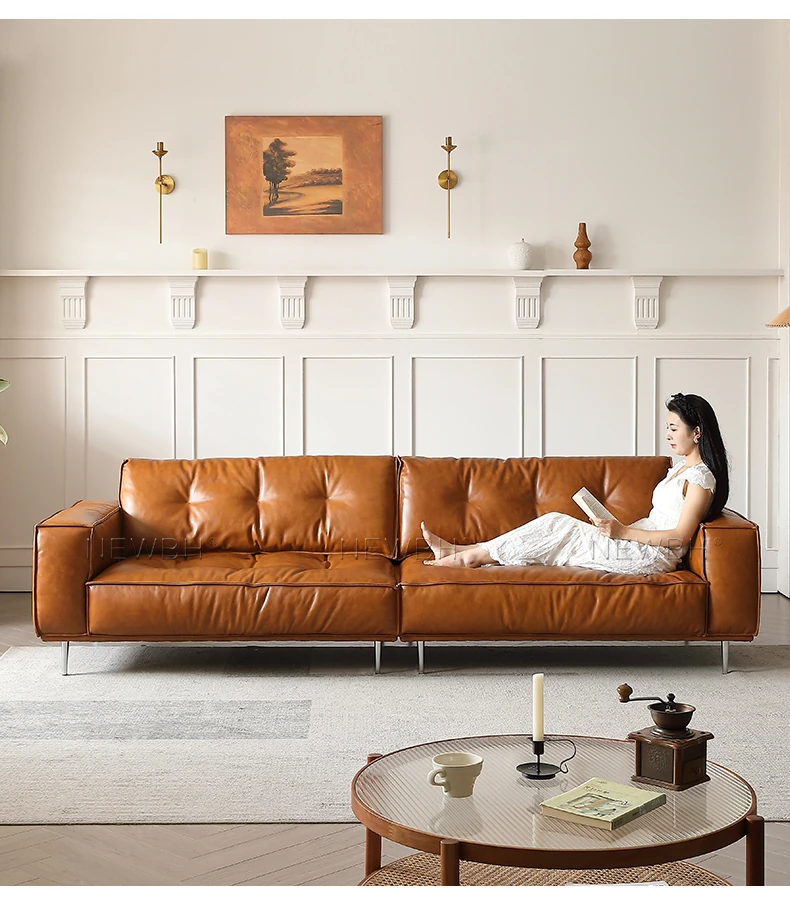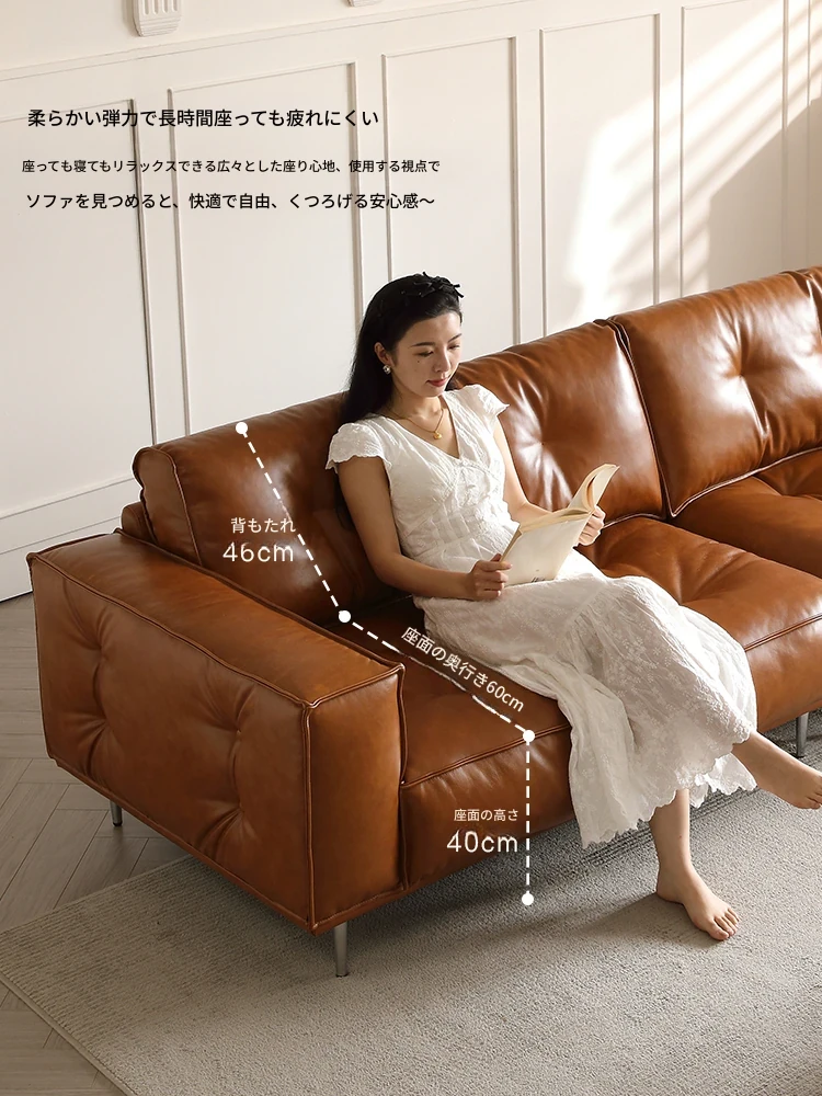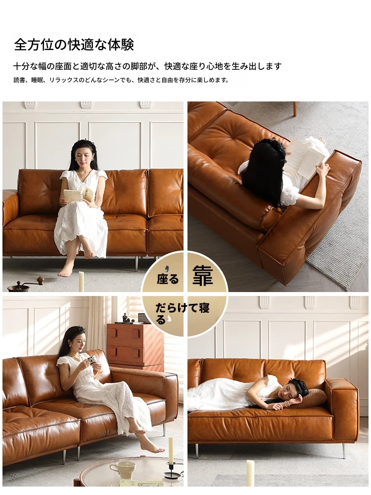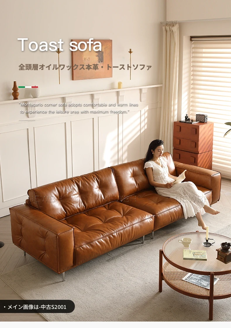 本格的なデザインの本革トーストソファ - 中古風のリビングに最適!デザイナーによる大小兼用、全頭層オイルワックスレザー使用の高品質ソファで、居心地の良い空間を演出します。