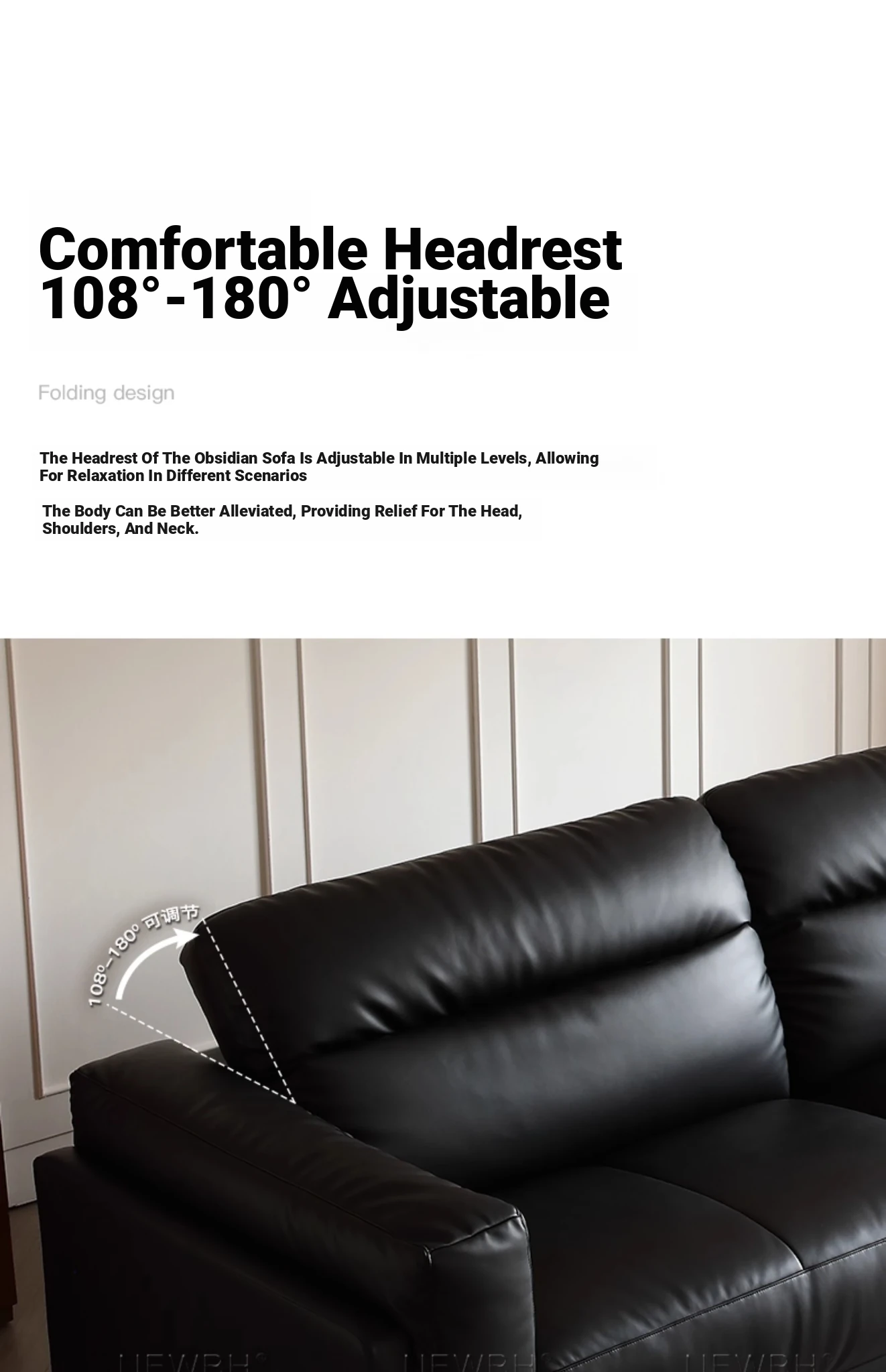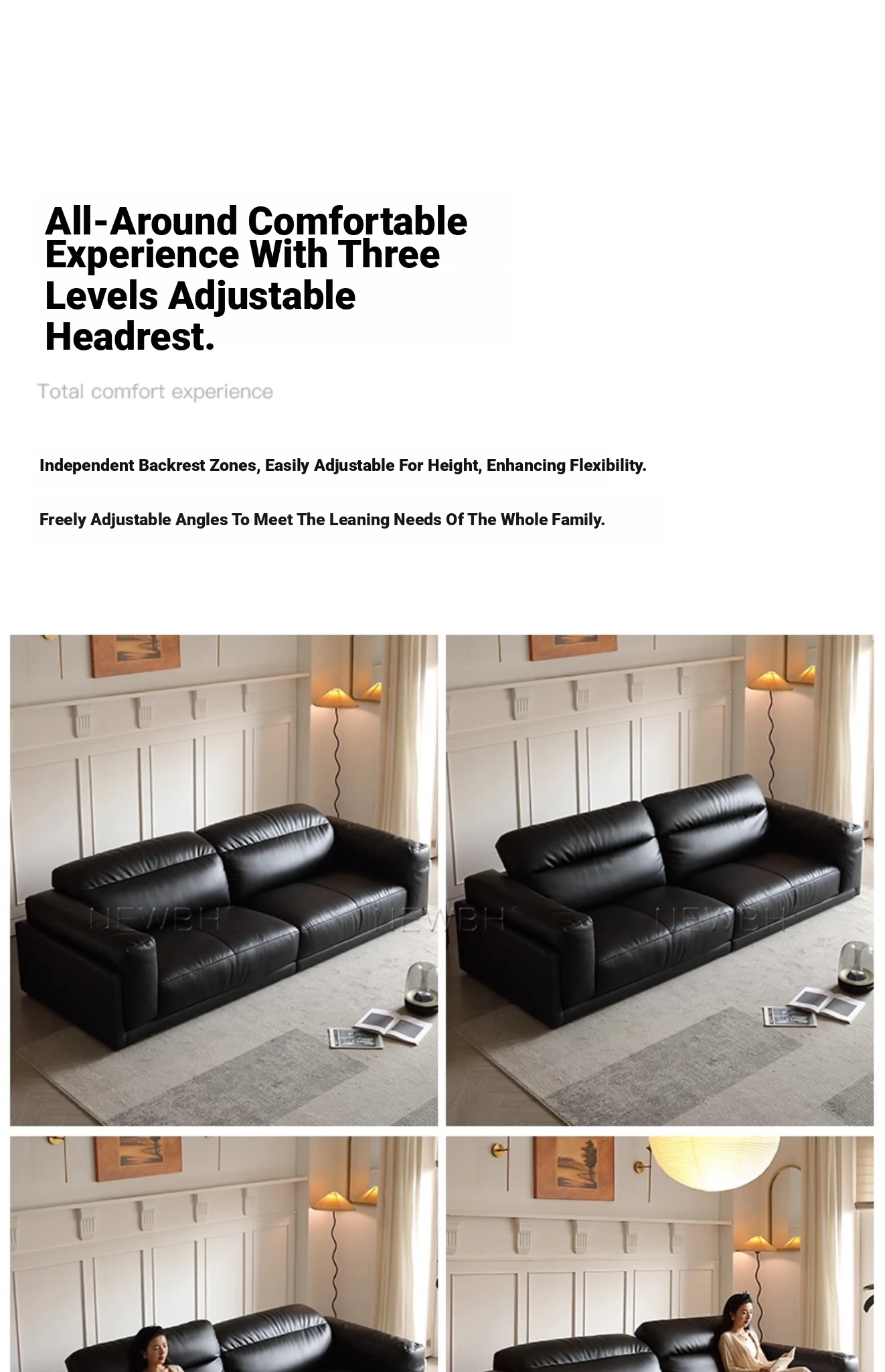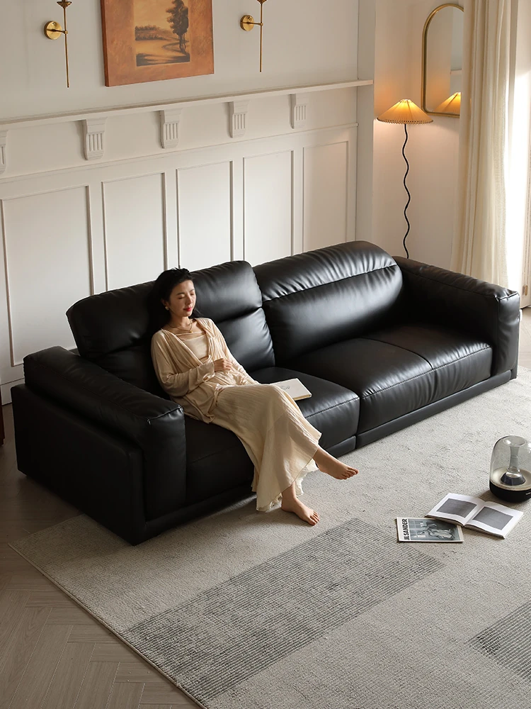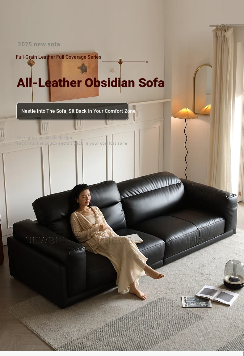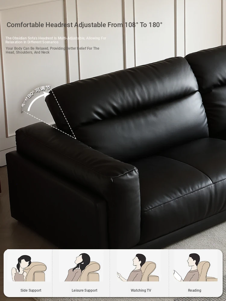 Vintage Genuine Leather Sofa with Adjustable Headrest - Retro Black Large Cowhide Sofa for Living Room, Full Top Grain Leather, Stylish and Comfortable